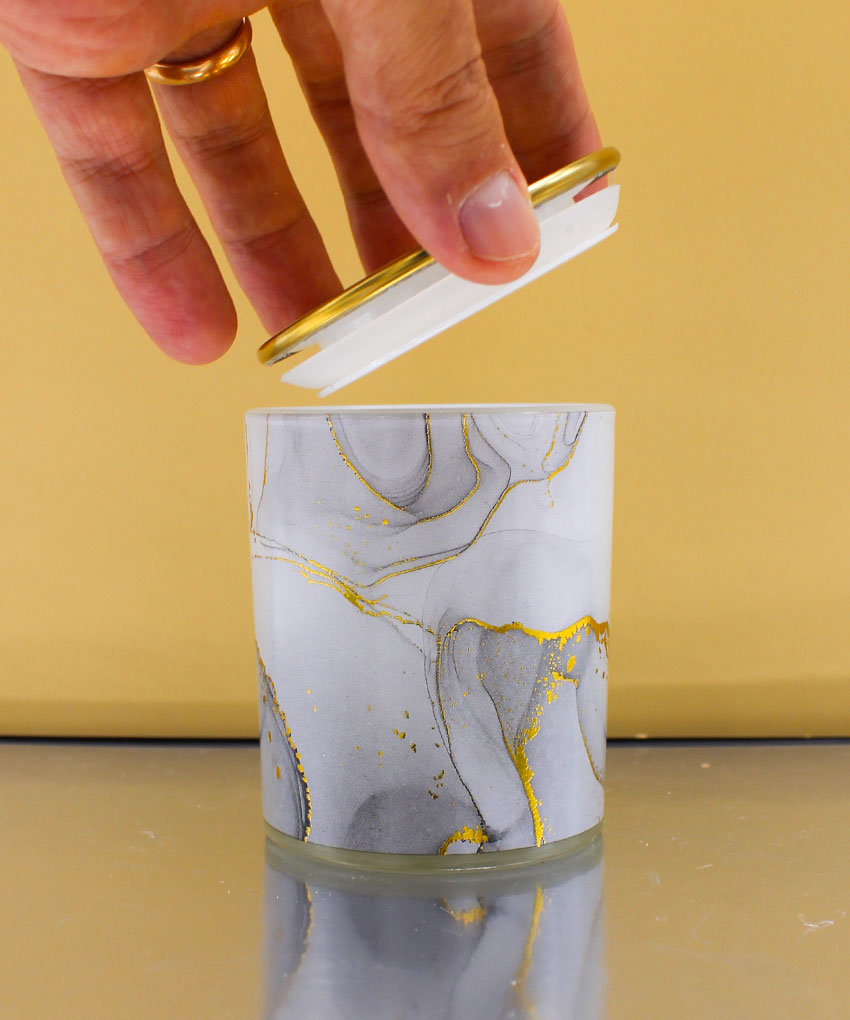 Candela in Bicchiere Effetto Marmo Grigio con Tappo Gold – Completa di Confezione