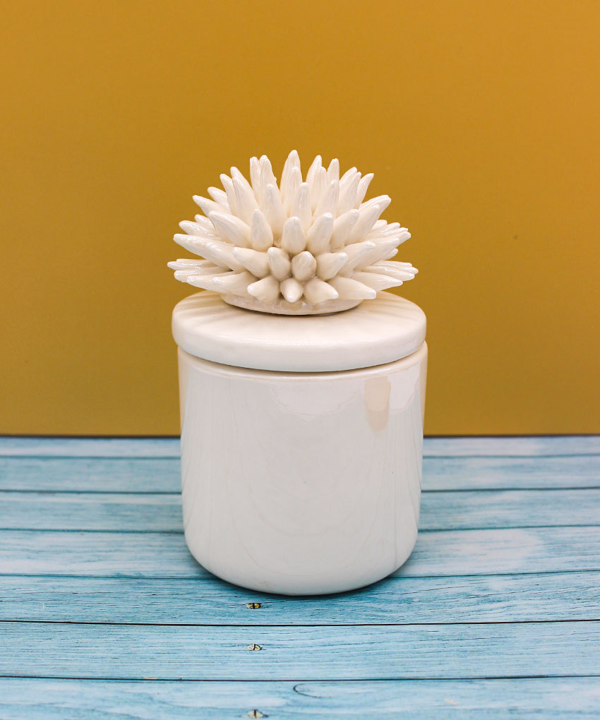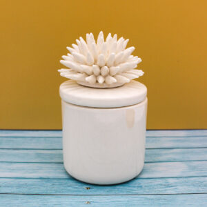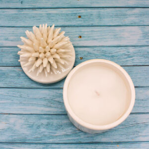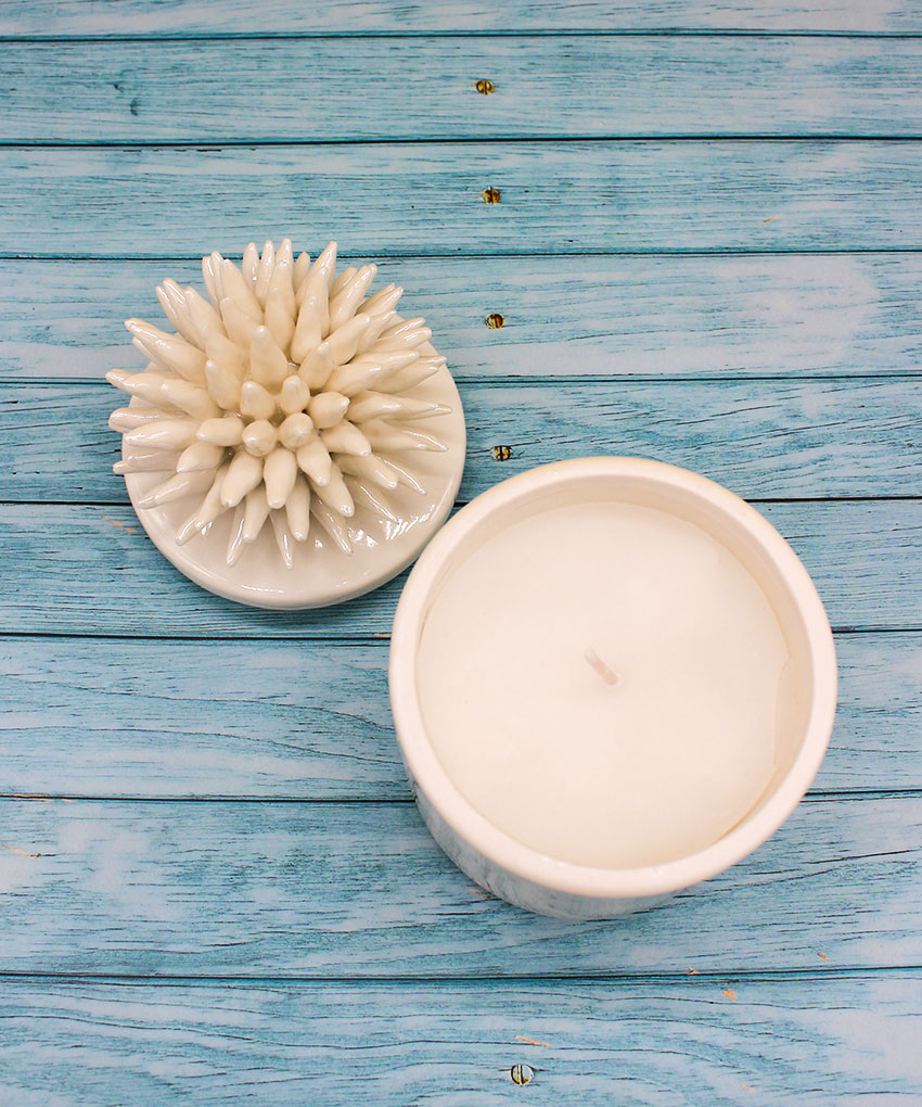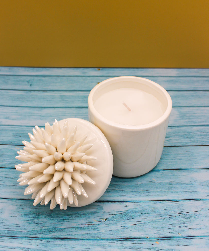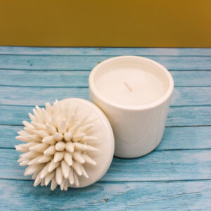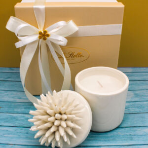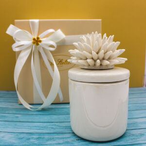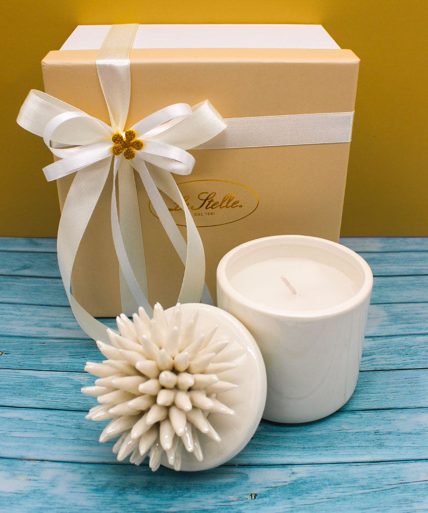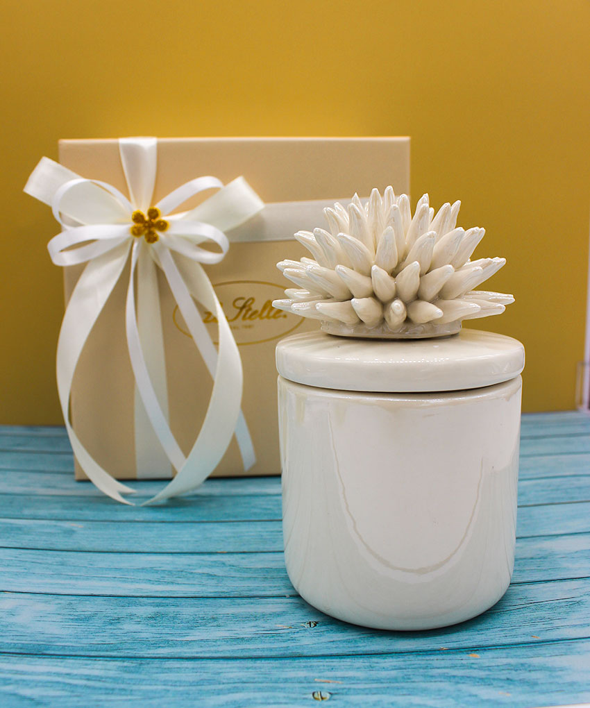 Candela in porcellana bianca con coperchio a forma di corallo, misura 7,5×7,5×h.11,5 cm. Completa di astuccio e confezione omaggio con 5 confetti al cioccolato.