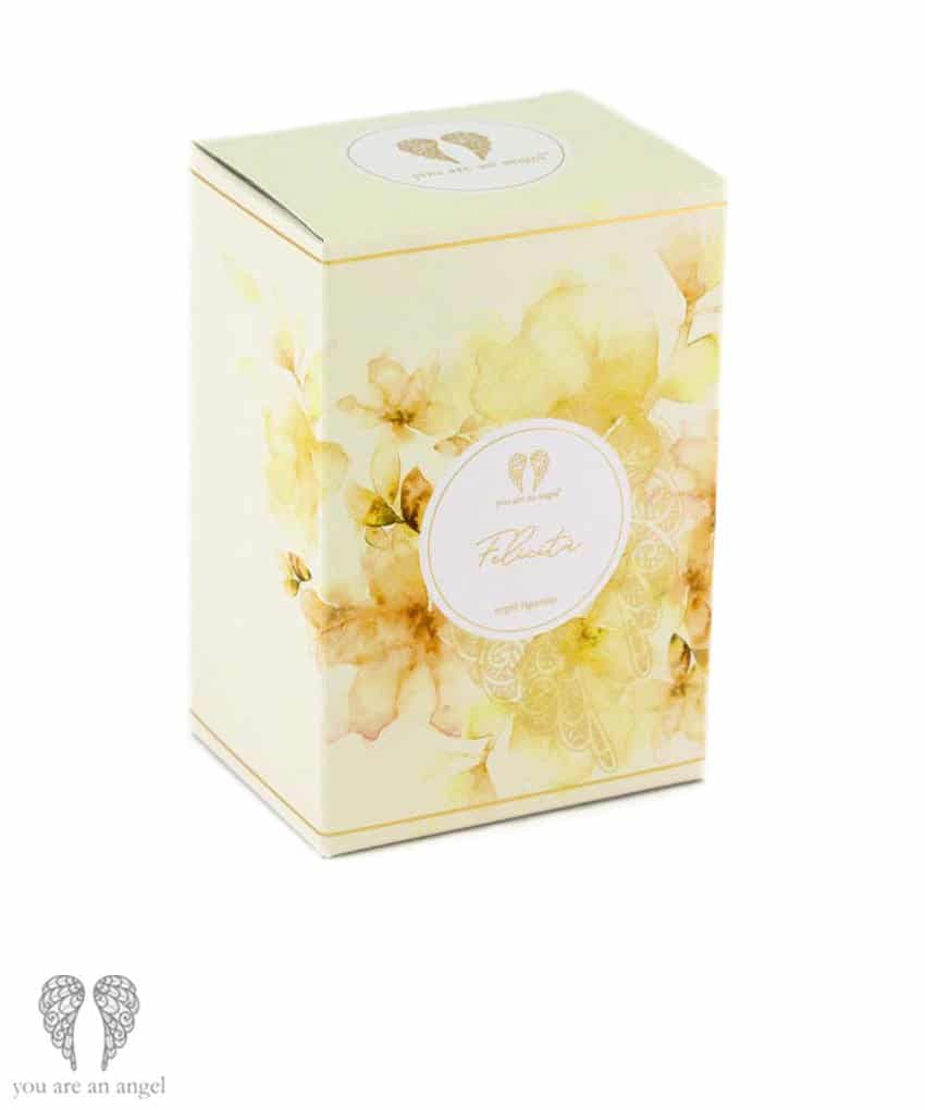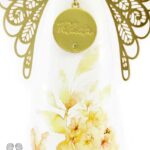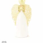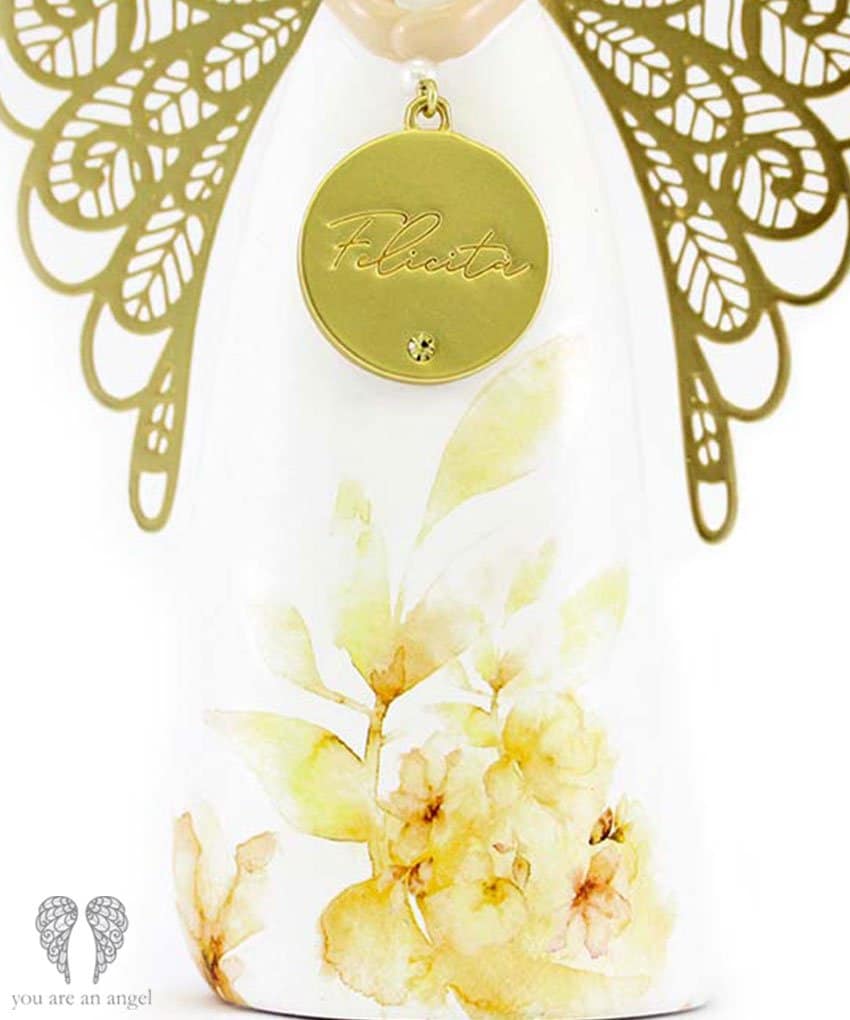 Angelo stilizzato con Ali e Ciondolo in metallo con incisione “Felicità” , applicazione di strass tra i capelli e nel cuore