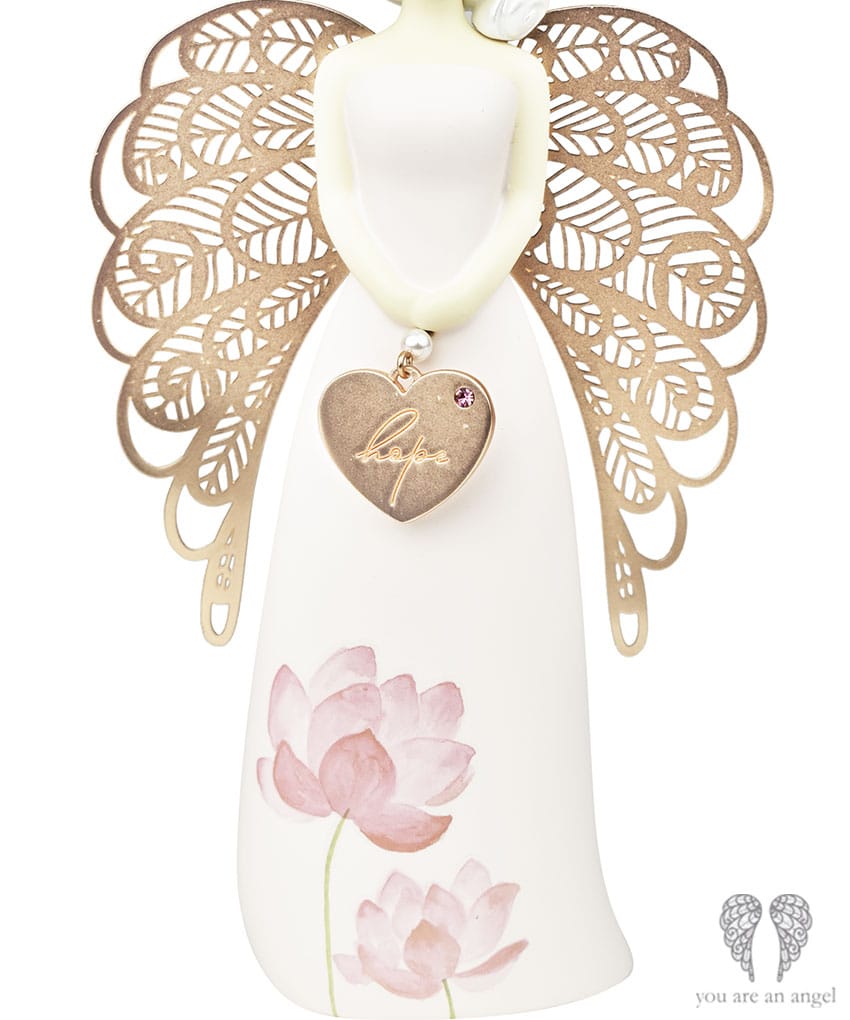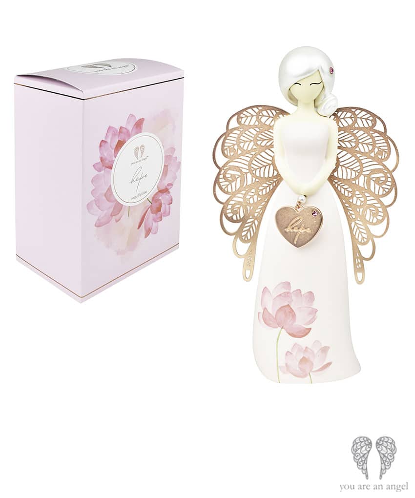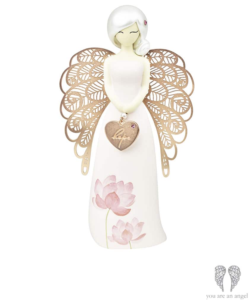 Le figure di You Are An Angel sono il regalo perfetto per far sapere a una persona cara quanto siano speciali e importanti per noi. Questo angelo ha ali in metallo argentato, un ciondolo a cuore in metallo su cui è inciso il sentimento “Hope – Speranza”. Ogni angelo è avvolto in una bellissima confezione regalo disegnata con dettagli in foglia oro. Perfetto come regalo e decorazione per la casa.