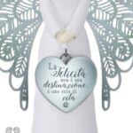 Angelo stilizzato con Ali e Cuore in metallo con incisione “la Felicità non è una destinazione, è uno stile di Vita” , applicazione di strass tra i capelli e nel cuore