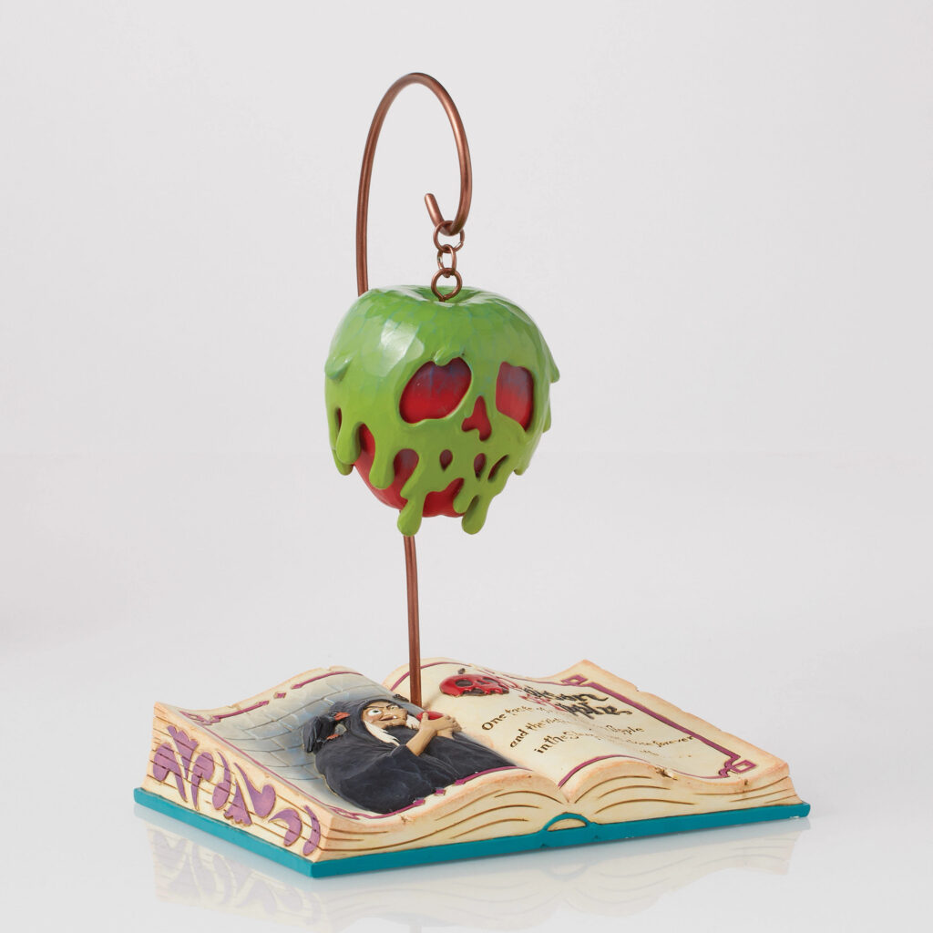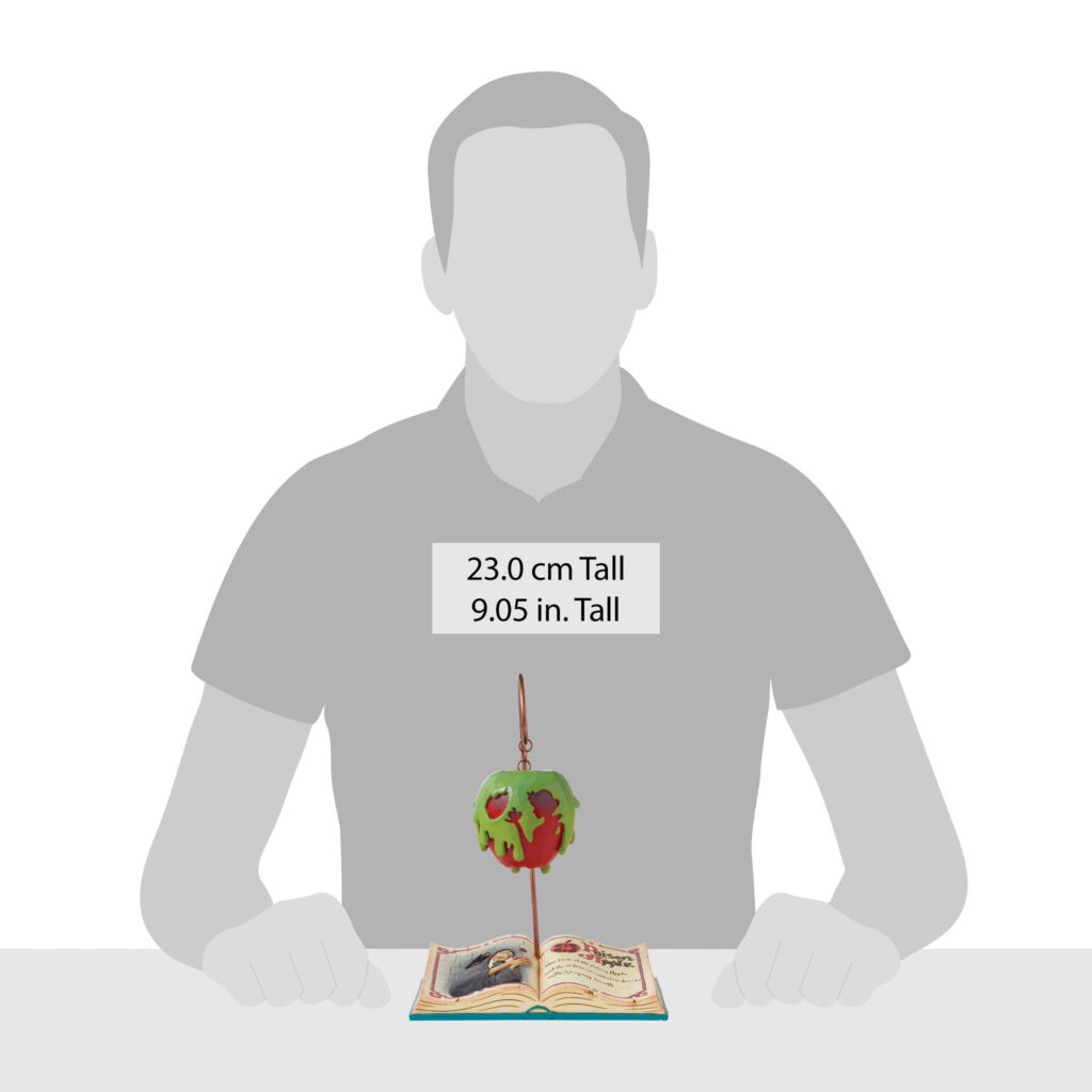 Questa statuetta di Jim Shore della linea Disney Traditions celebra un momento iconico de Biancaneve: un libro delle favole aperto mostra una pagina dedicata alla mela avvelenata, mentre una mela rossa pende delicatamente da un filo sopra il libro. Il design unisce la magia della fiaba Disney con lo stile folk-art di Jim Shore, rendendola un pezzo decorativo raffinato e narrativo, perfetto per collezionisti adulti.