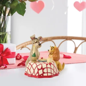 Una romantica scena in stile Jim Shore dedicata a Lilli e il Vagabondo: Lady e il Vagabondo condividono un piatto di spaghetti, mentre uno spaghetto unisce i loro sguardi in un momento tenero e nostalgico. La statuetta, realizzata in resina di pietra (“stone resin”), è decorata con dettagli folk-art tipici dell’artista, come motivi patchwork e rosemaling, e include una luce LED che illumina delicatamente la scena, rendendola perfetta per la decorazione o la collezione.