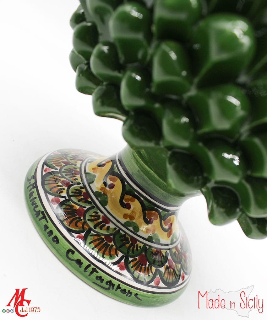 Gli abili ceramisti siciliani realizzano da sempre splendide pigne di ogni dimensione e colore. Questa tradizione nasce dall’usanza di realizzare pigne per ornare le testiere dei letti in ferro battuto, nelle camere da letto degli sposi. Un segno di buon augurio e di prosperità. L’abbondanza dei semi della pigna era simbolo di unione immortale e fertilità.