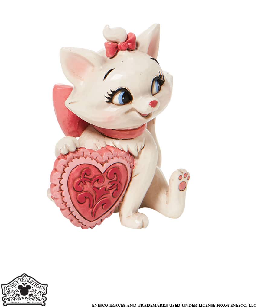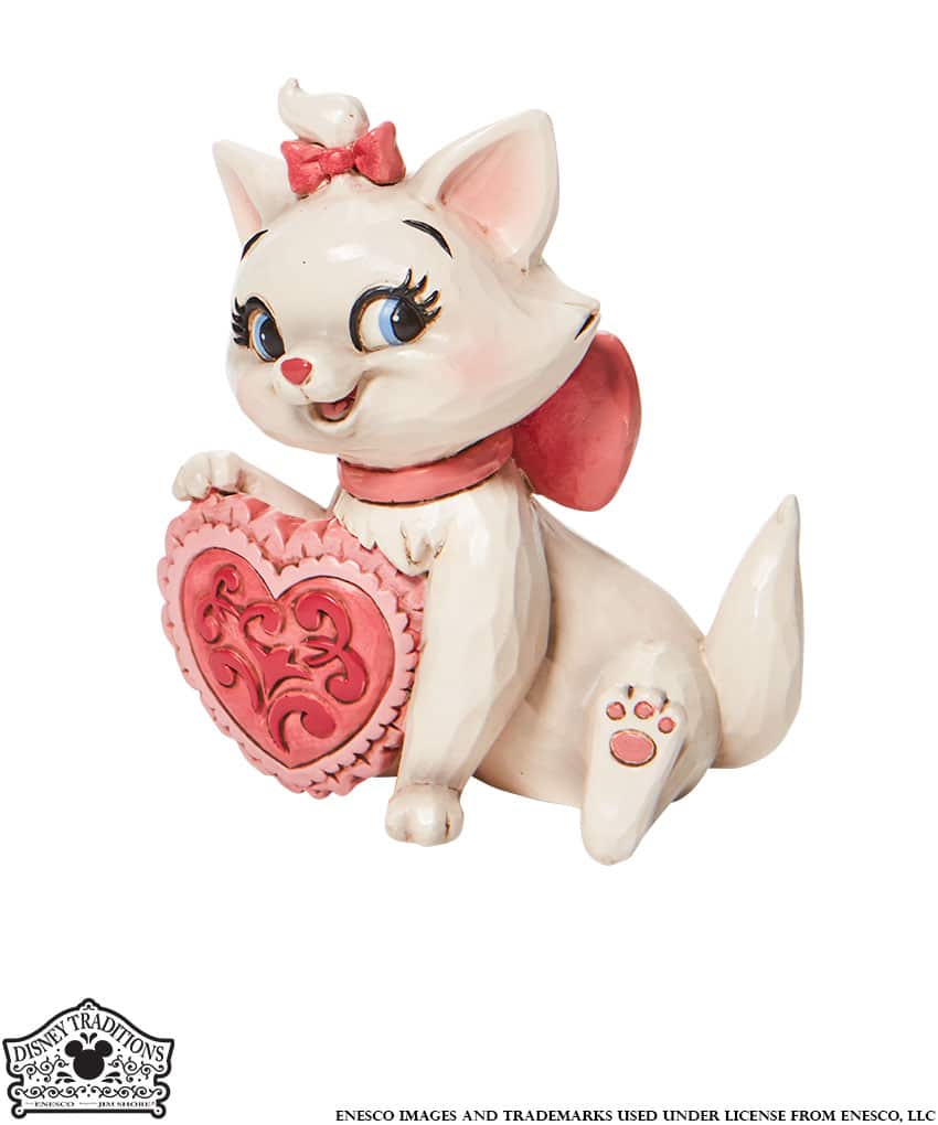 Figura di Maria degli Aristogatti, classico di Walt Disney uscito nel 1970, con in mano un cuore rosa. Il regalo perfetto per San Valentino. Progettato dal pluripremiato artista e scultore Jim Shore per la collezione Disney Traditions.