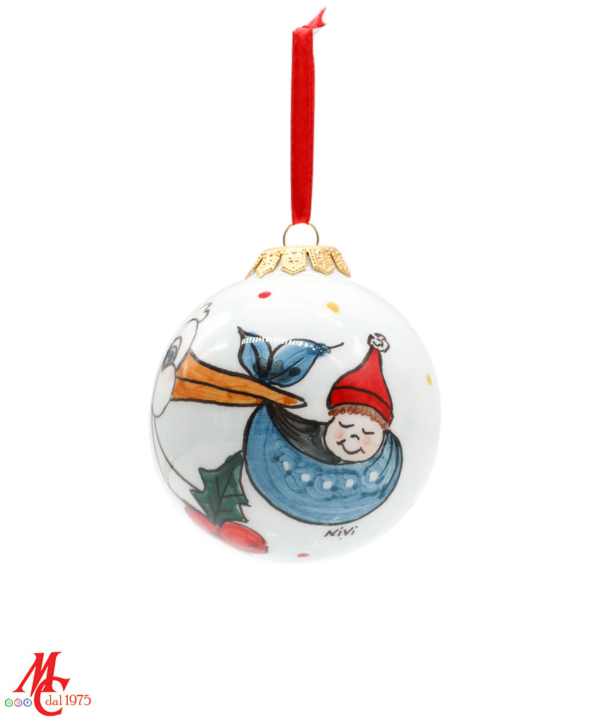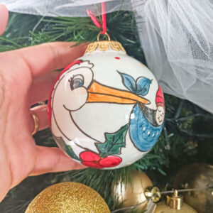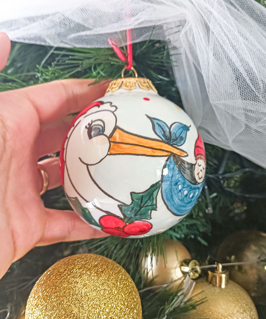 Pallina di Natale in Ceramica Dipinta a Mano – Cicogna con Bambino