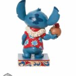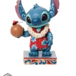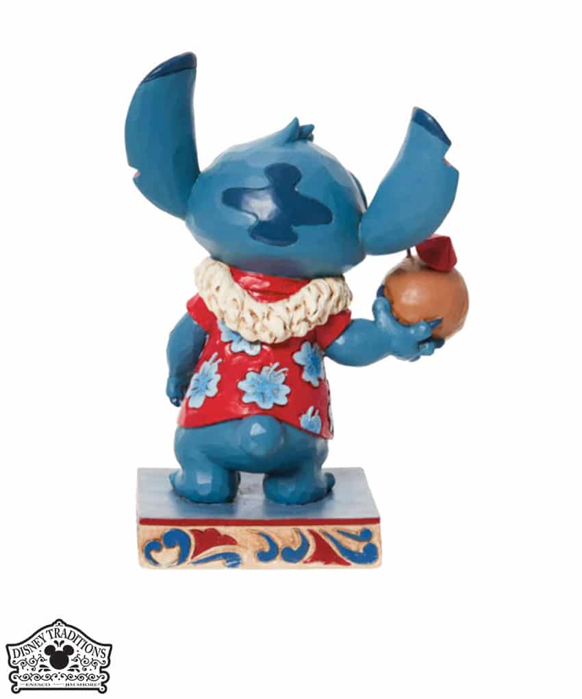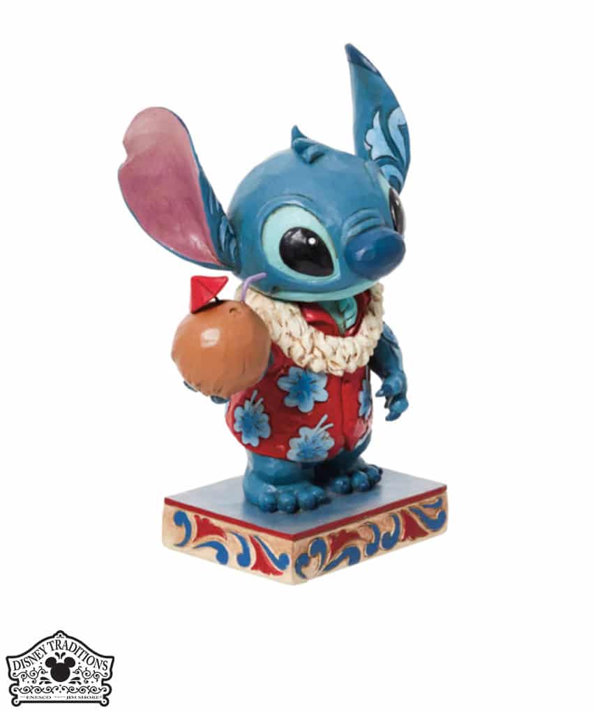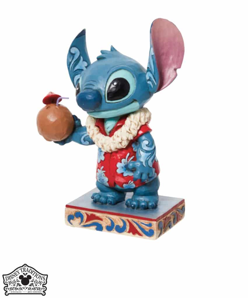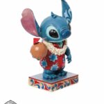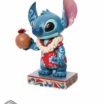 Figura di Stitch, l’alieno preferito della Disney, vestito con una camicia hawaiana e una collana di fiori Lei, sorseggiando acqua da una noce di cocco. Progettato per il 20° anniversario di Lilo e Stitch, dal pluripremiato artista e scultore Jim Shore per il marchio Disney Traditions.