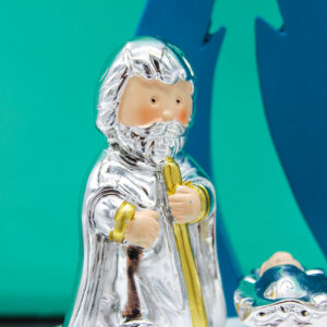 Questo elegante presepe con capanna e soggetti della Sacra Famiglia in finitura argento (Giuseppe, Maria e Gesù Bambino) è una bomboniera perfetta per il periodo natalizio e un raffinato complemento d’arredo per chi ama le decorazioni sacre.
