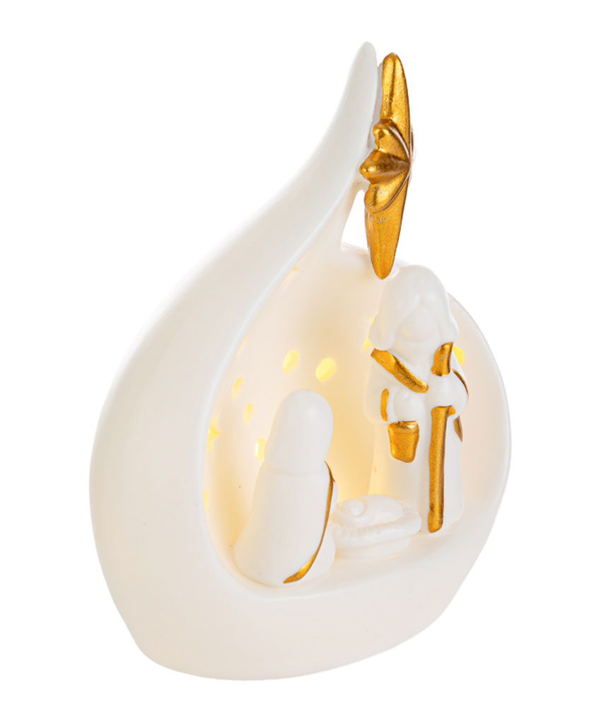Realizzato in porcellana finemente lavorata, presenta una scena della Natività delicata e armoniosa, valorizzata da una luce LED interna che illumina dolcemente le figure, creando un’atmosfera calda e raccolta.