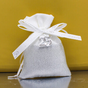 Elegante sacchettino bomboniera nei toni bianco e argento, impreziosito da applicazione “25°” silver con strass e nastrini coordinati. Perfetto per celebrare le Nozze d’Argento con stile e raffinatezza.