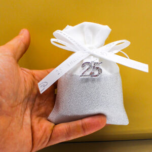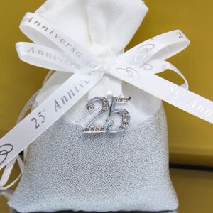 L’applicazione frontale “25°” in colore silver arricchita da strass dona luminosità e prestigio alla bomboniera, rendendola un ricordo speciale per amici e parenti. I nastrini bianchi con scritta “25° Anniversario” completano il design con un tocco armonioso e celebrativo.