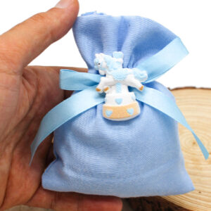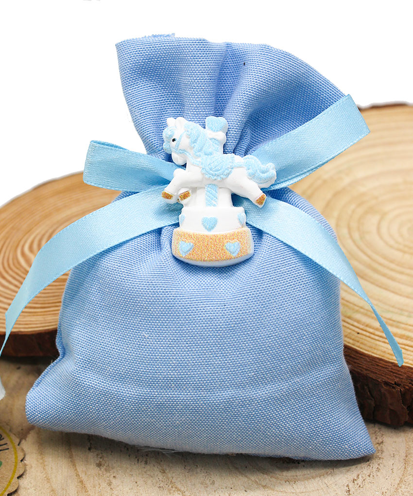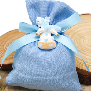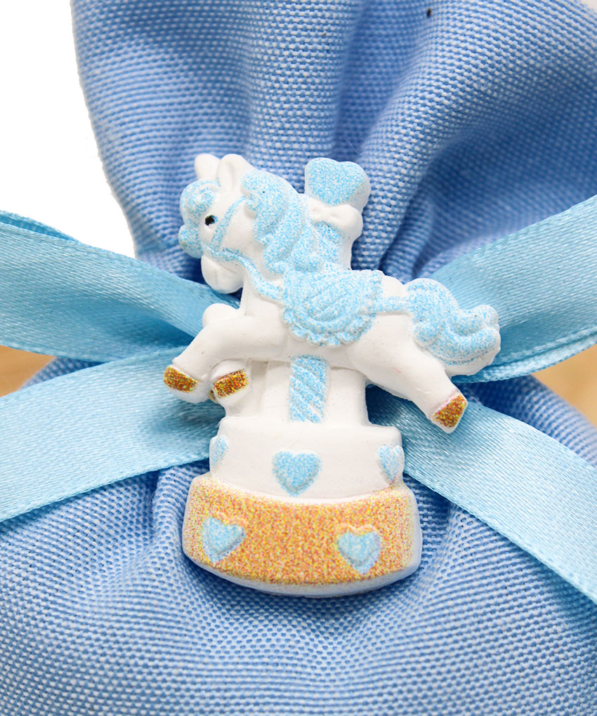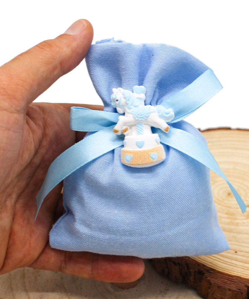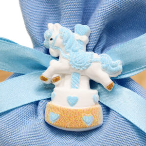 Delicato sacchettino bomboniera di colore celeste, decorato con applicazione a forma di giostrina, simbolo di dolcezza e tenerezza. Una bomboniera ideale per celebrare la nascita di un bambino o un Battesimo, pensata per offrire agli invitati un ricordo raffinato e già pronto per essere donato.