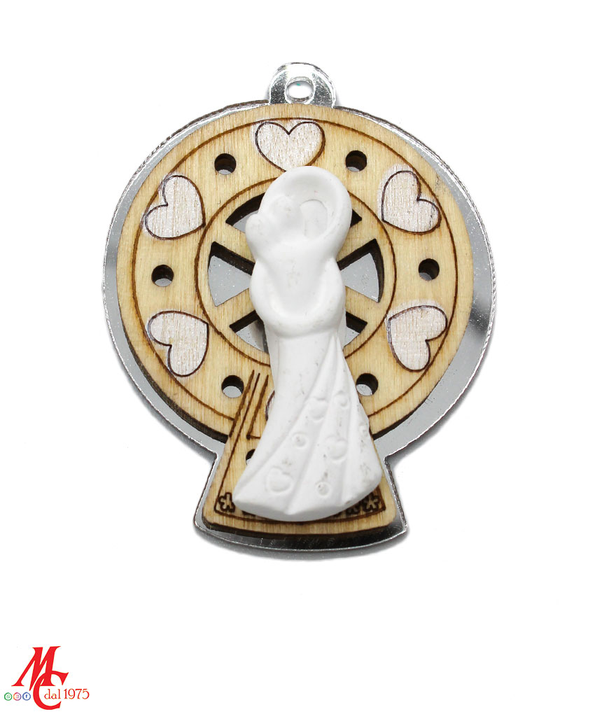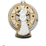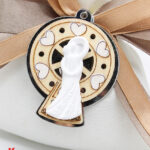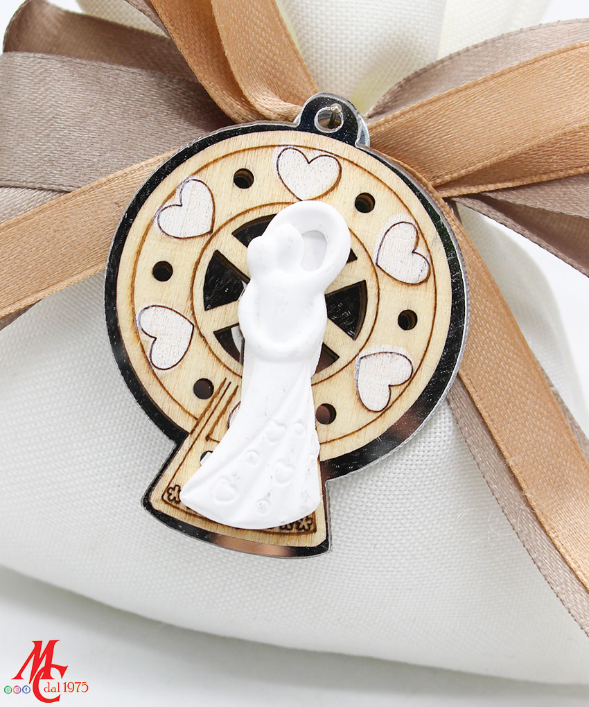 Il sacchettino bianco è impreziosito da un’applicazione che combina materiali come legno e plexiglass per creare una ruota panoramica in due eleganti colori: oro e argento. La coppia di sposi stilizzata in bianco aggiunge un tocco di raffinatezza e romanticismo, perfetto per celebrare il giorno più speciale della vostra vita.