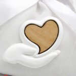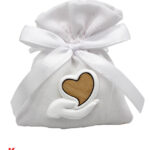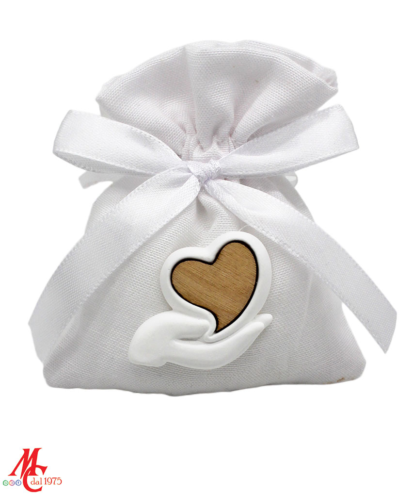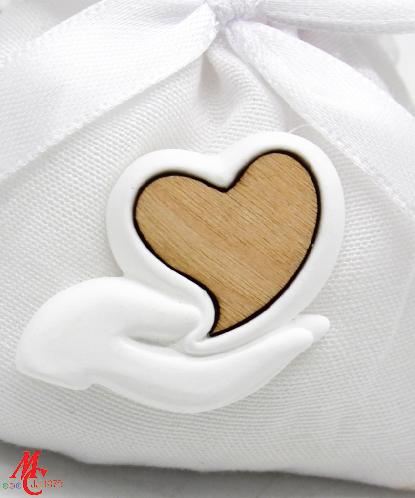 Il sacchettino è realizzato in stoffa bianca di alta qualità, decorato con una delicata applicazione in resina e legno che raffigura un cuore su una mano. Questa combinazione di materiali dona un tocco naturale e sofisticato alla bomboniera, rendendola perfetta per qualsiasi evento elegante.