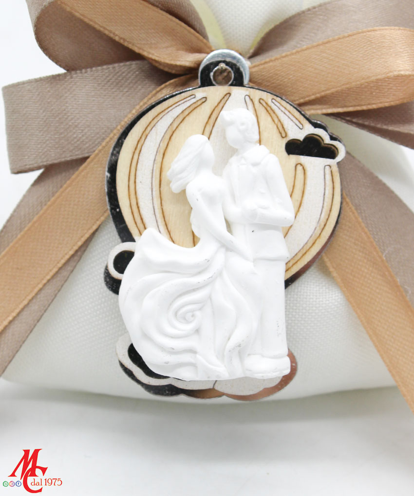 Bomboniera / Bustina Matrimonio: Sacchettino con Applicazione Fondo Mongolfiera in Legno e Plex Colore Argento con Coppia Stilizzata Bianco