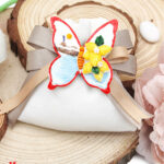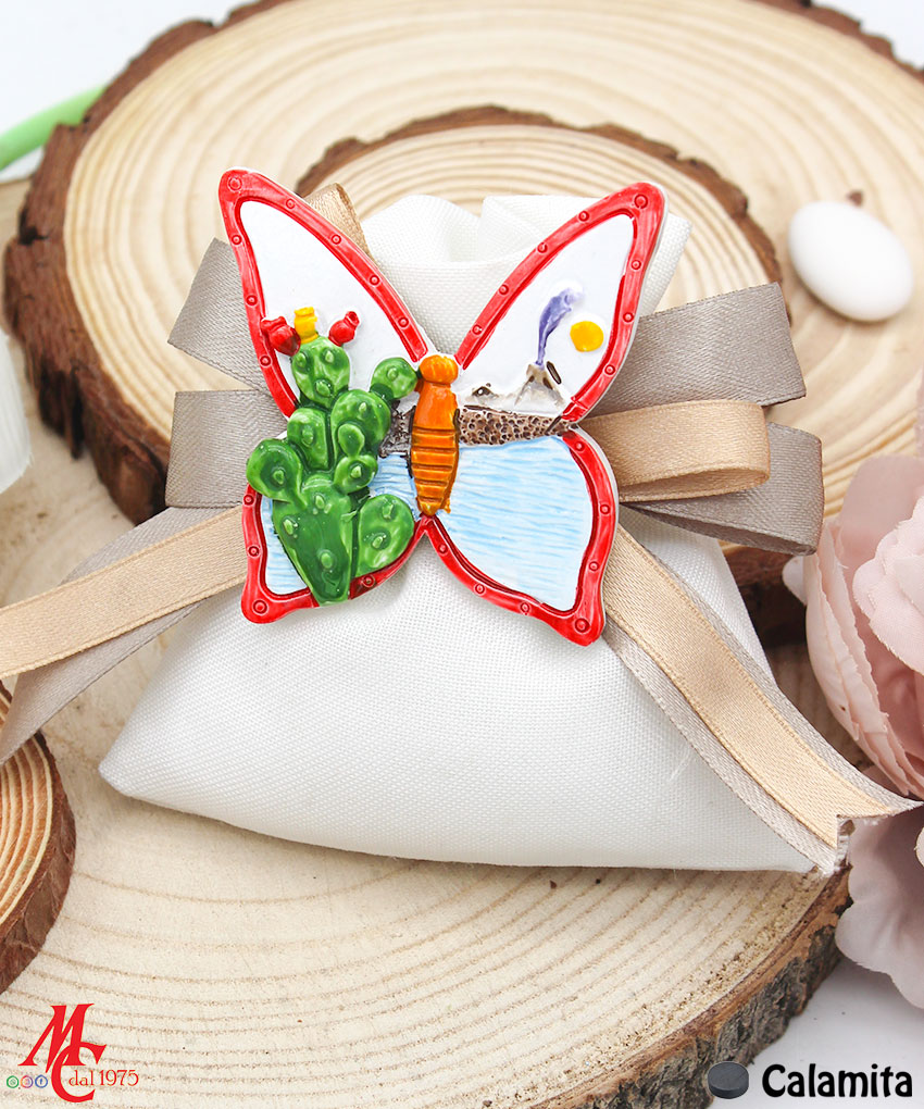 Ogni sacchettino rosso, elegante e raffinato, contiene un magnete decorativo a forma di farfalla con un incantevole decoro paesaggistico. I magneti sono disponibili in due modelli assortiti, ognuno con un design unico e dettagliato che rappresenta la bellezza della natura. Questo rende la bomboniera non solo un ricordo del tuo evento, ma anche un oggetto decorativo per la casa dei tuoi ospiti.