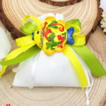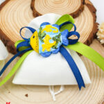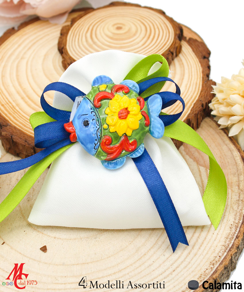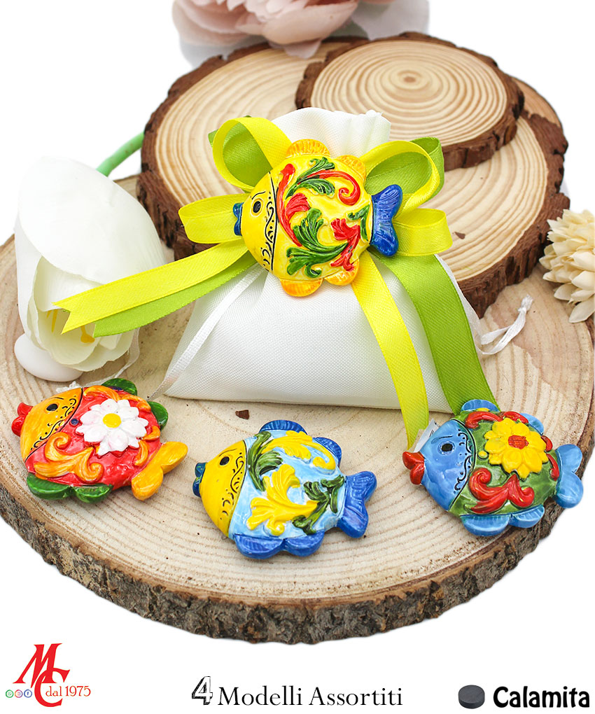 Ogni sacchettino bianco è arricchito da un magnete che rappresenta pesciolini decorati con splendide maioliche siciliane, simbolo della tradizione artigianale italiana. I 4 modelli assortiti offrono una varietà di stili e colori che si abbinano perfettamente a qualsiasi tema di festa.