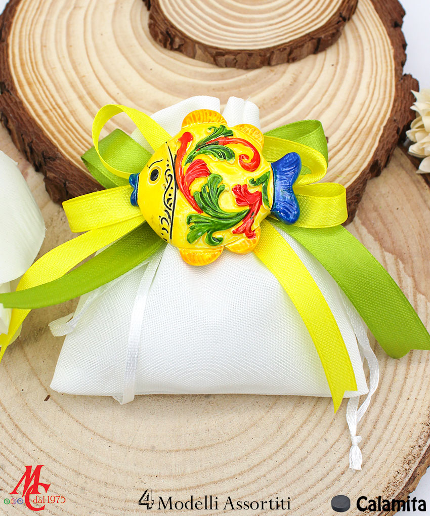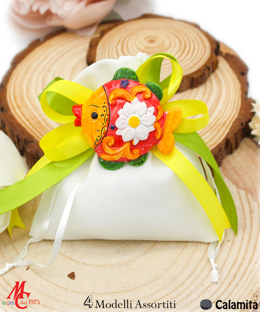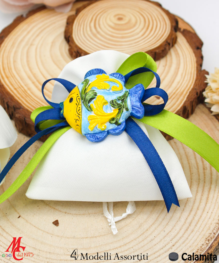 Bomboniera / Bustina: Sacchettino con Applicazione Magnete Pesciolini Decoro Maioliche Siciliane