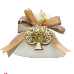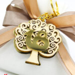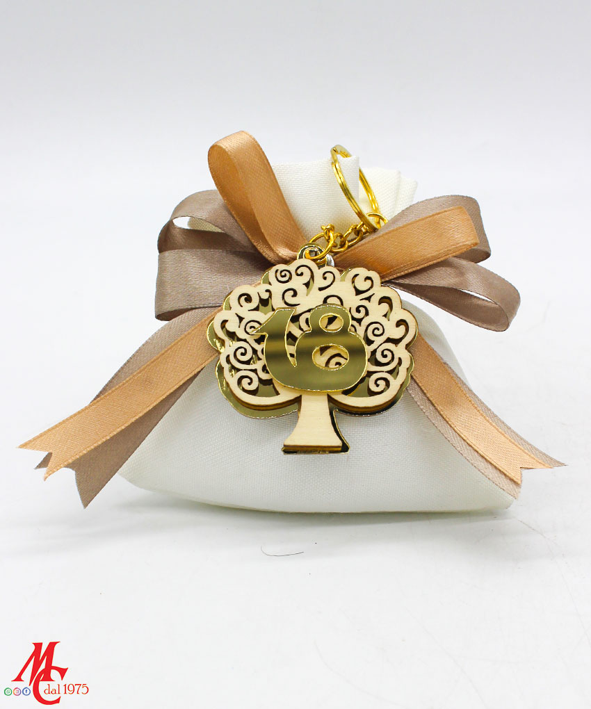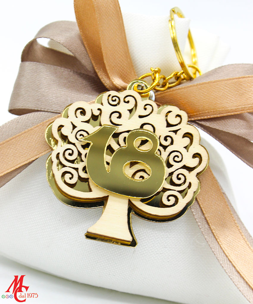 Bomboniera / Bustina: Sacchettino con Portachiavi Albero della Vita in Legno con Numero 18 in Plex Oro