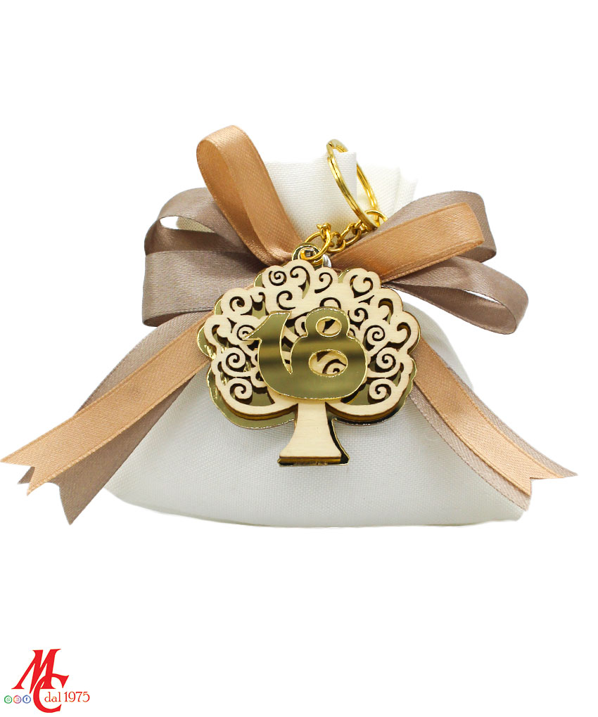 Bomboniera / Bustina 18° Compleanno: Sacchettino con Portachiavi Albero della Vita in Legno con 18 in Plex Color Oro