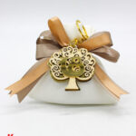 La bomboniera viene fornita con un sacchetto bianco elegante, decorato con nastrini e accompagnato da 5 confetti al cioccolato, creando un connubio perfetto tra eleganza e dolcezza per celebrare un evento così importante. Le dimensioni del sacchetto, 10 cm x 12 cm, sono ideali per presentare un regalo raffinato ma anche pratico.