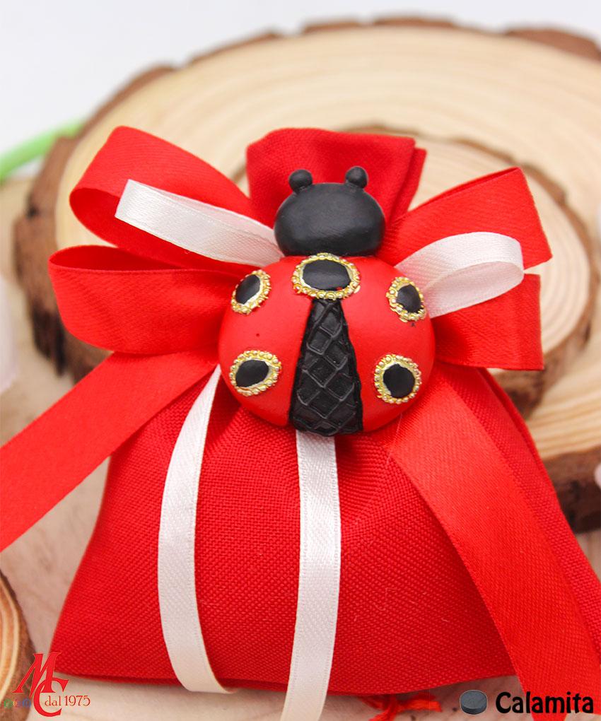 Il sacchettino rosso, simbolo di successo e buon auspicio, è abbellito con un magnete raffigurante una coccinella portafortuna, un elemento perfetto per un’occasione di laurea. La coccinella, simbolo di fortuna e prosperità, rende questa bomboniera un ricordo significativo per i tuoi ospiti.