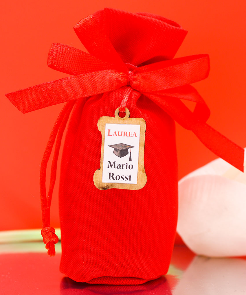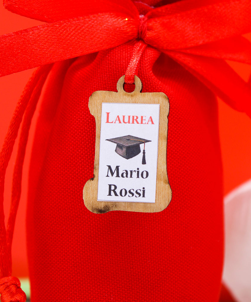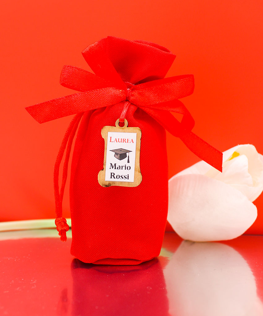 Festeggia il traguardo accademico con un sacchettino laurea rosso personalizzato con il nome del laureato! Questa bomboniera laurea è perfetta per lasciare un ricordo speciale agli invitati, grazie all’applicazione in legno con stampa personalizzata. Un dettaglio unico che rende ogni sacchetto esclusivo e memorabile.