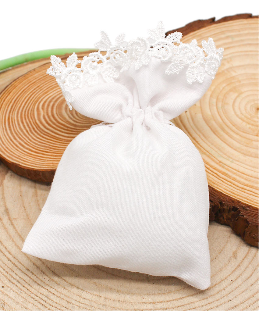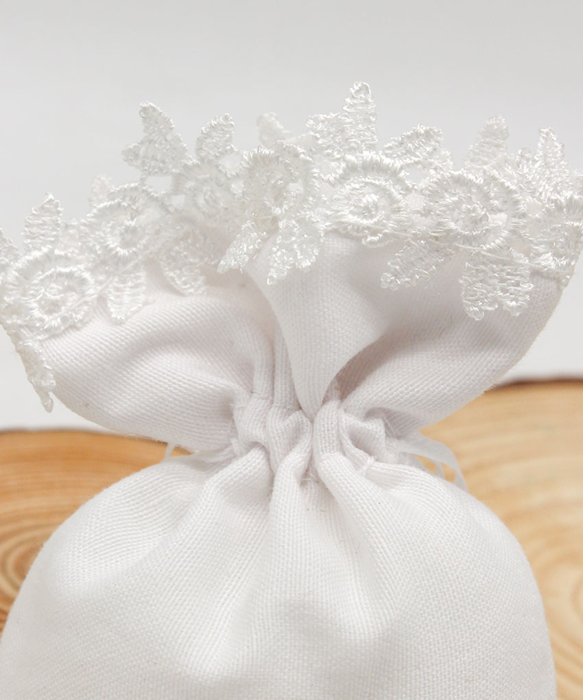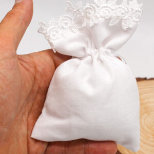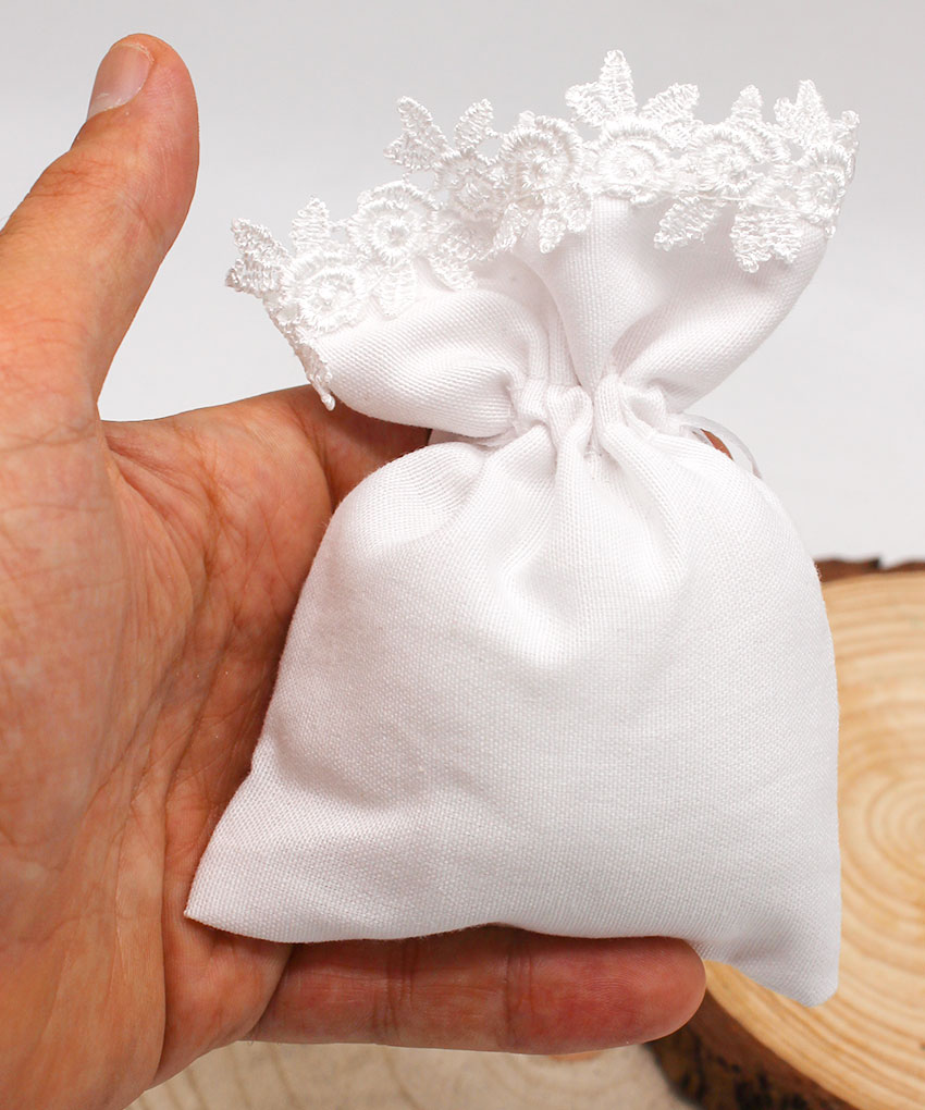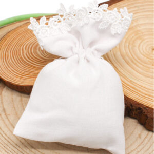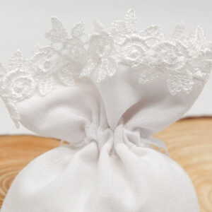 Elegante e raffinato sacchettino bomboniera in colore bianco, impreziosito da un delicato bordino in macramè che dona un tocco artigianale e senza tempo. Una soluzione sobria ma ricercata, ideale per cerimonie classiche e moderne, perfetta per Battesimo, Comunione, Cresima e altre ricorrenze importanti.