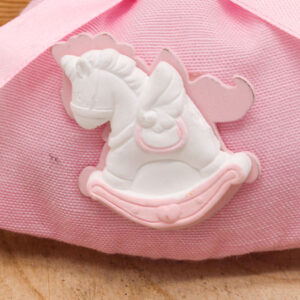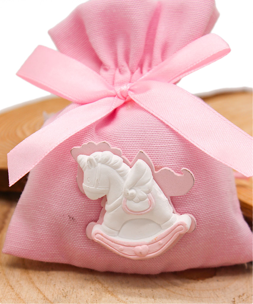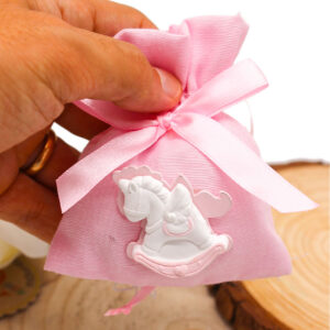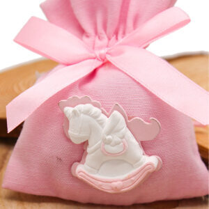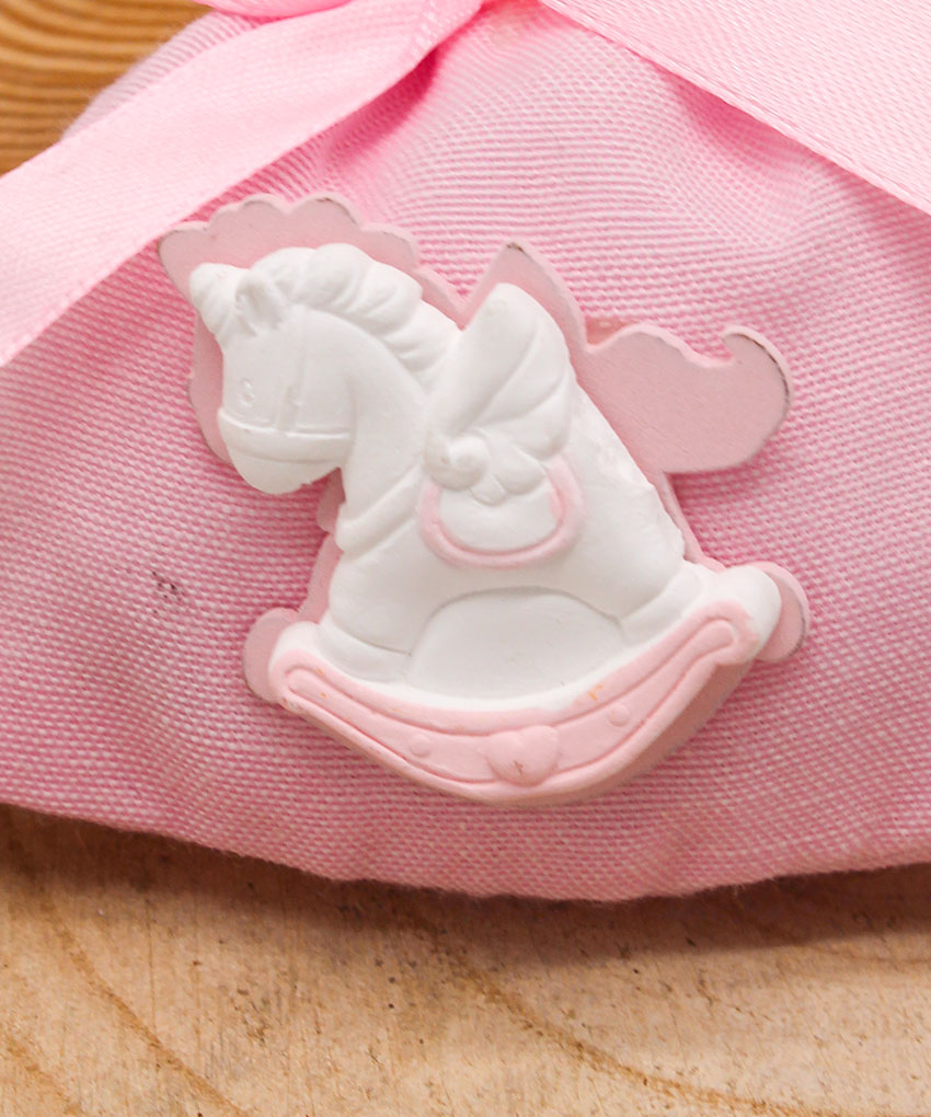 Delicato sacchettino bomboniera di colore rosa, decorato con applicazione a forma di cavalluccio a dondolo in resina. Una bomboniera dolce ed elegante, perfetta per celebrare eventi come nascita, battesimo e ricorrenze dedicate ai più piccoli.