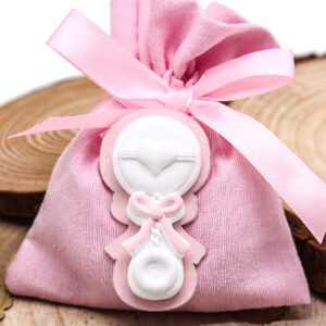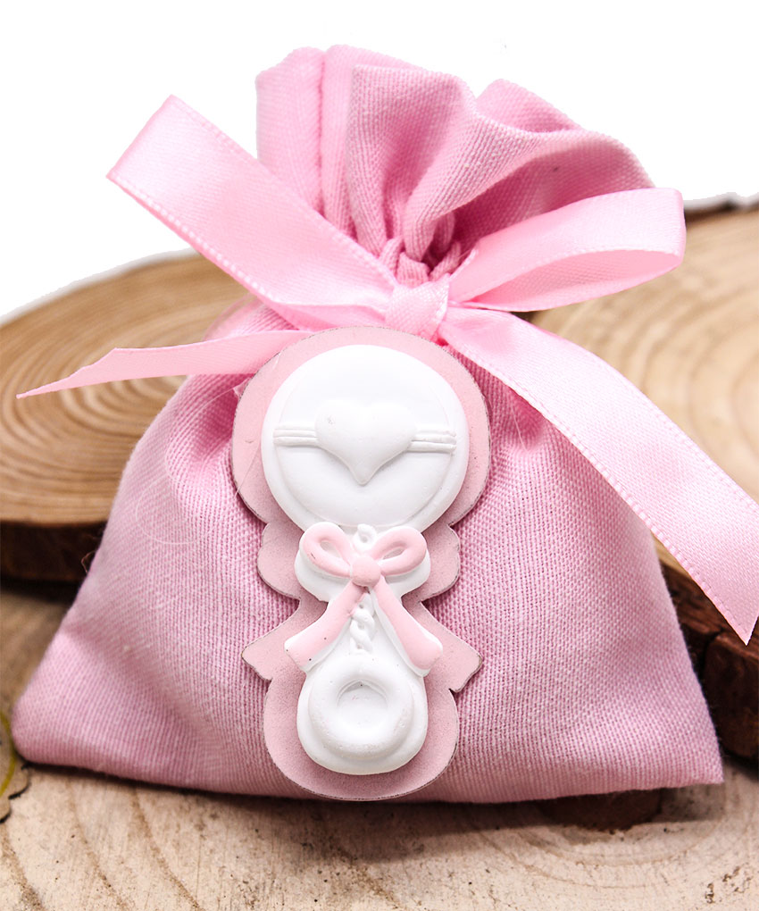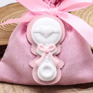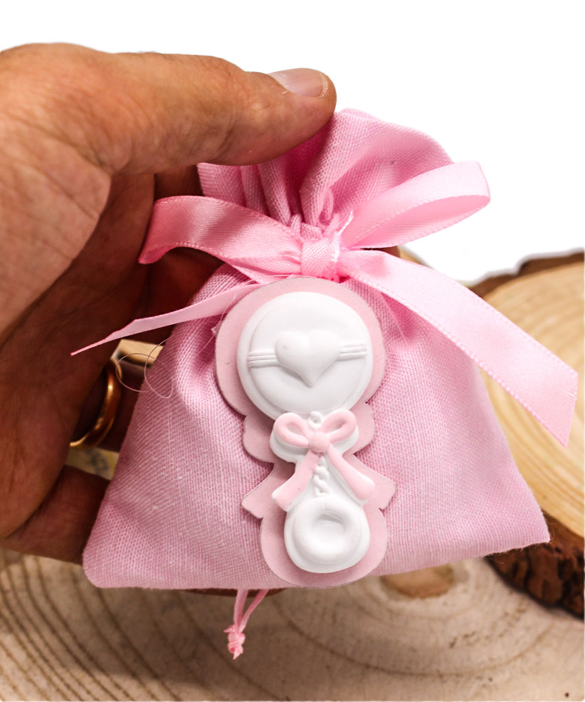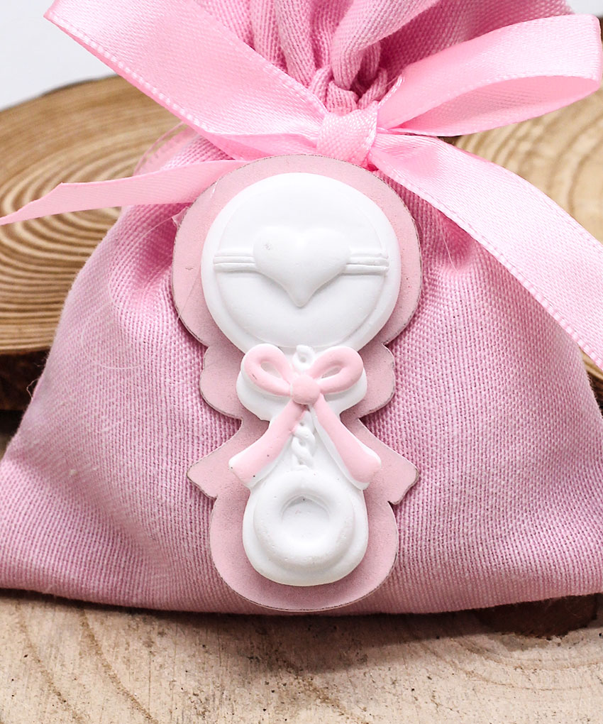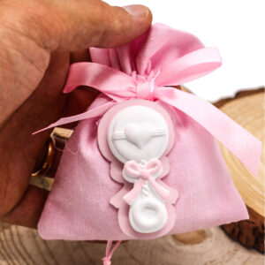 Delicato sacchettino bomboniera di colore rosa, decorato con applicazione a forma di sonaglino, simbolo dolce e raffinato ideale per celebrare la nascita o il battesimo di una bimba. Una bomboniera tenera ed elegante, perfetta da donare ad amici e parenti in un’occasione speciale.