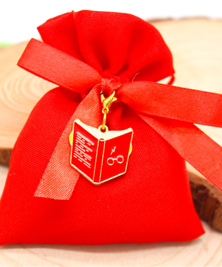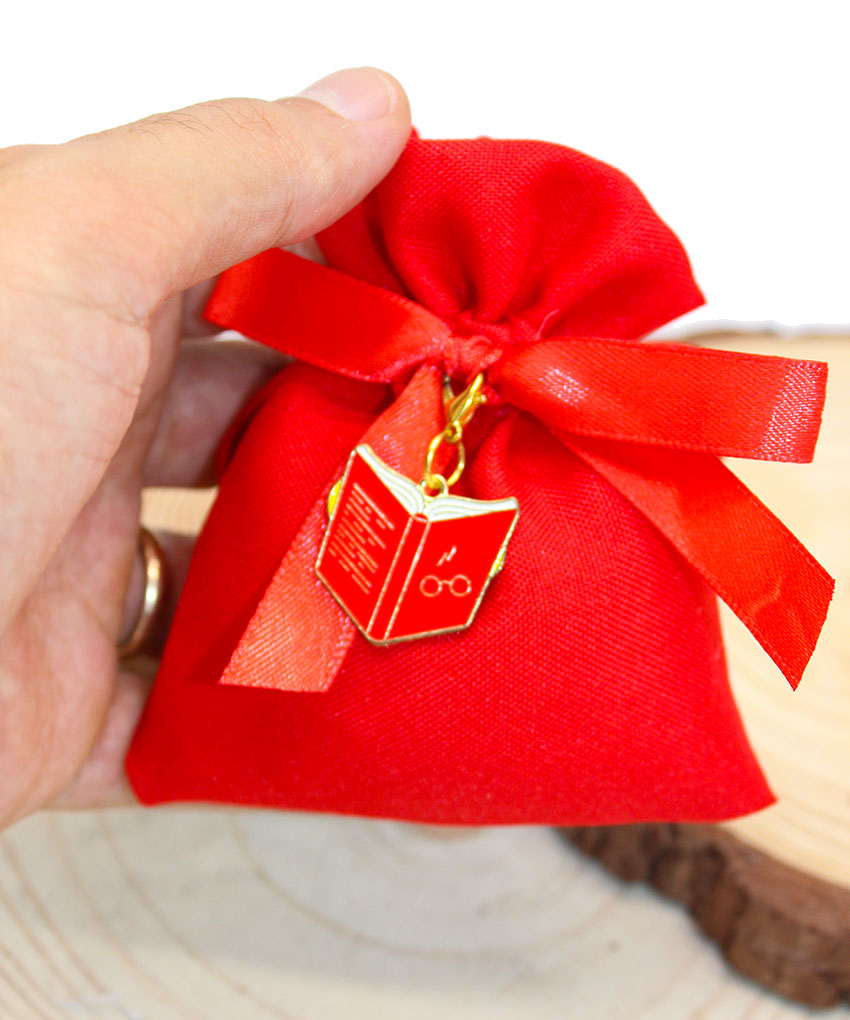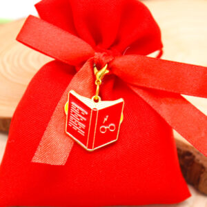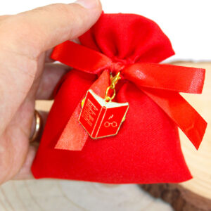 Elegante sacchettino bomboniera di colore rosso, simbolo tradizionale della laurea, arricchito da charms a forma di libro laurea. Una bomboniera raffinata e significativa, perfetta per celebrare il conseguimento di un importante traguardo accademico e condividere questo momento speciale con amici e parenti.