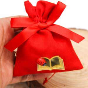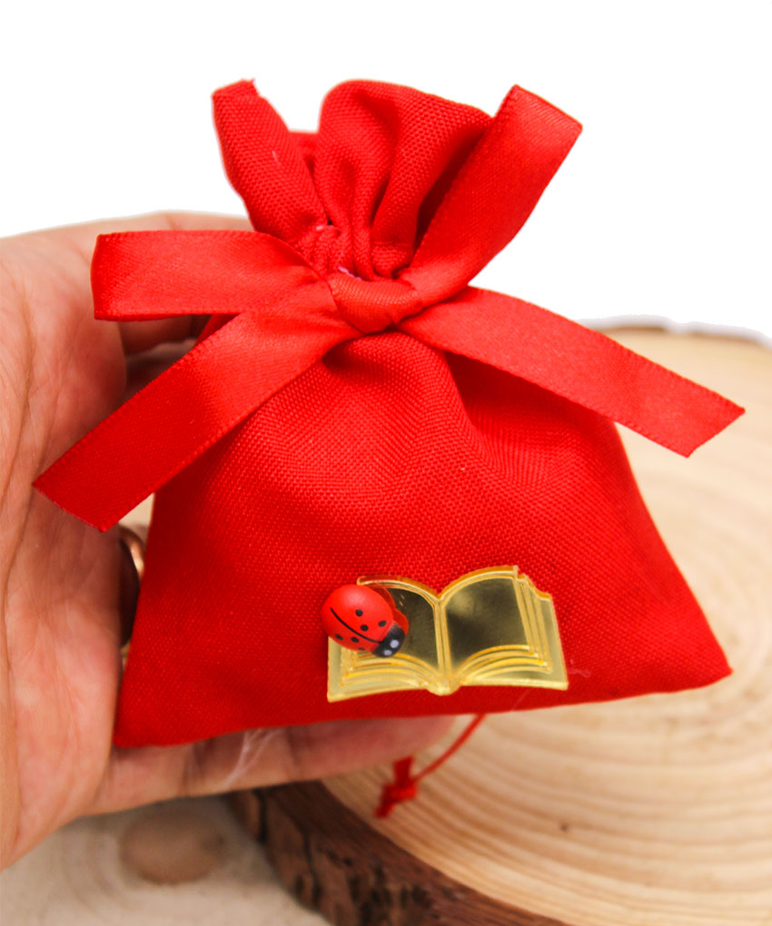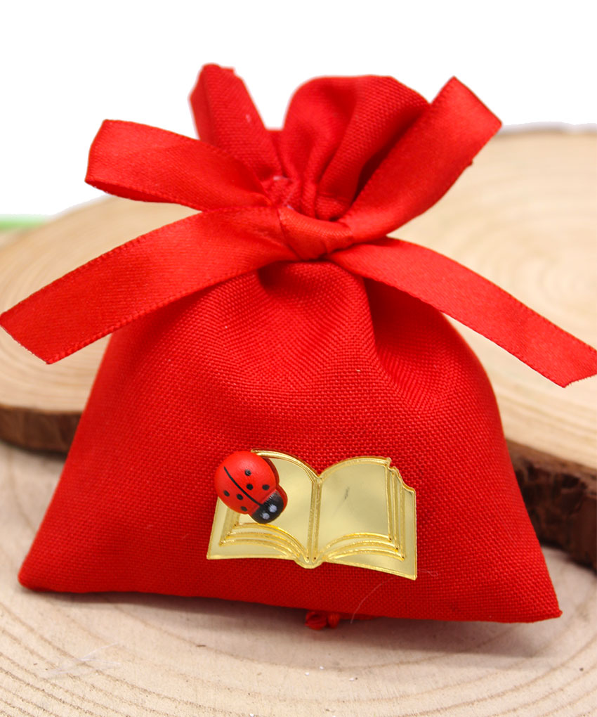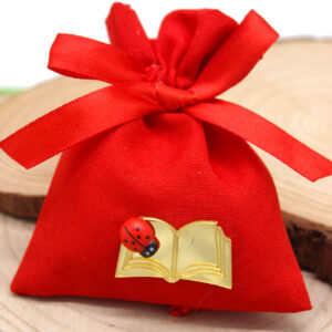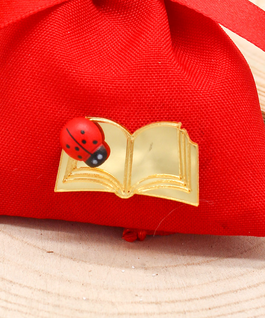 Elegante sacchettino bomboniera di colore rosso, simbolo tradizionale della laurea, impreziosito da applicazione a forma di libro in plex color oro e coccinella portafortuna. Una bomboniera raffinata e ricca di significato, ideale per celebrare il conseguimento della laurea e condividere questo traguardo importante con amici e parenti.