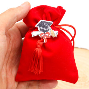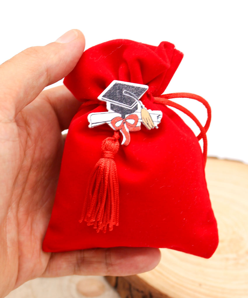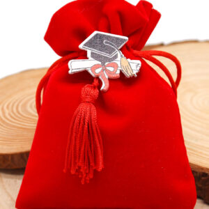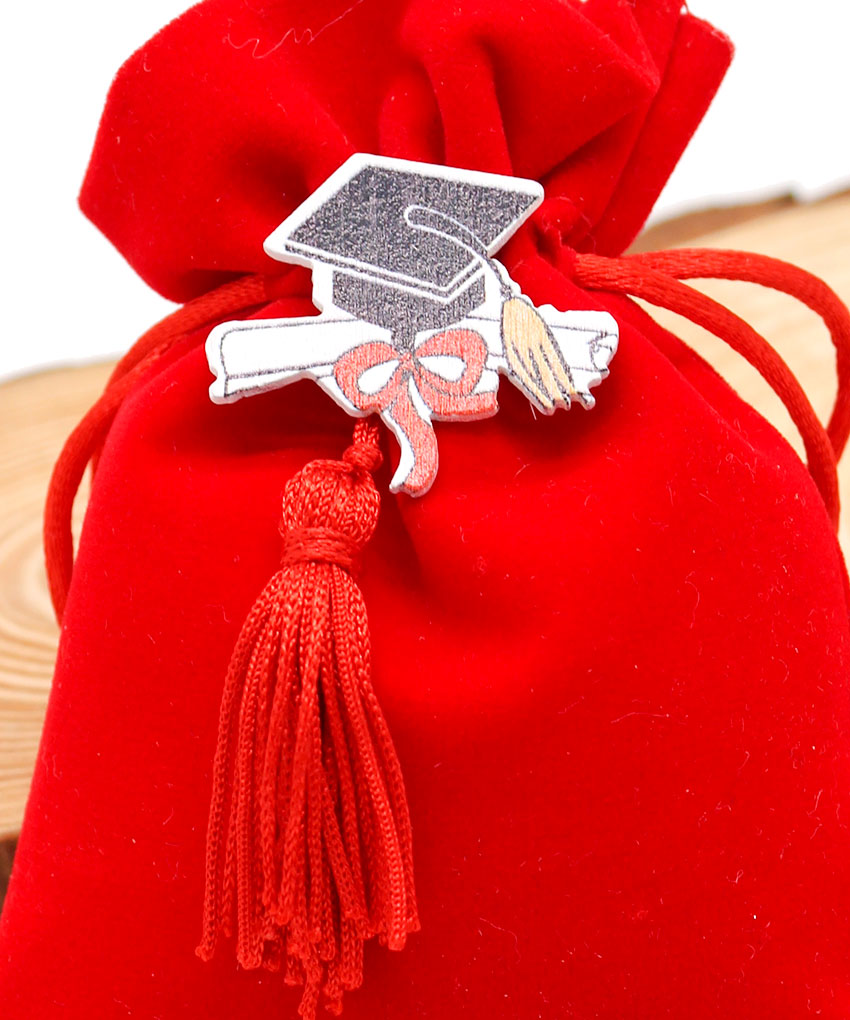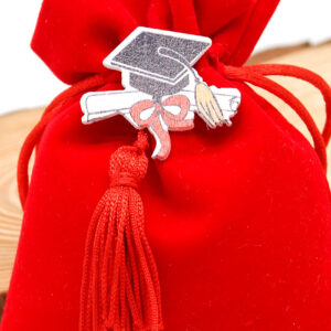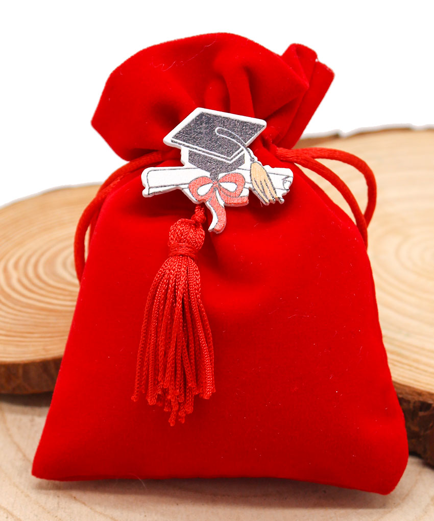 Elegante sacchettino bomboniera di colore rosso, simbolo tradizionale della laurea, decorato con applicazione a forma di cappello tocco in legno e nappina rossa. Una bomboniera raffinata e simbolica, ideale per celebrare il conseguimento della laurea e condividere questo importante traguardo con amici e parenti.