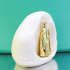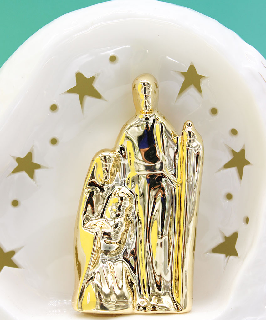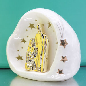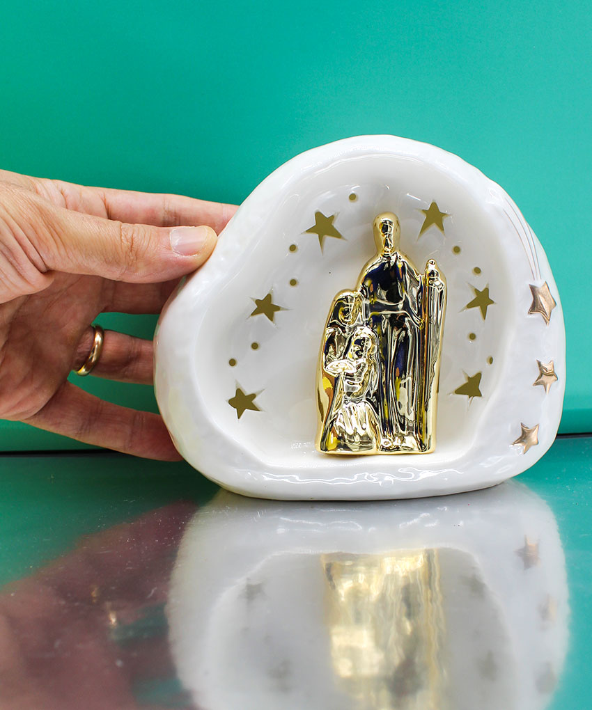 Realizzata in porcellana bianca con raffinati dettagli dorati, presenta stelle traforate che permettono alla luce di diffondersi creando un effetto luminoso caldo e suggestivo. Le dimensioni di 14,5×9×h.12 cm la rendono perfetta sia come complemento d’arredo, sia come bomboniera elegante e significativa.