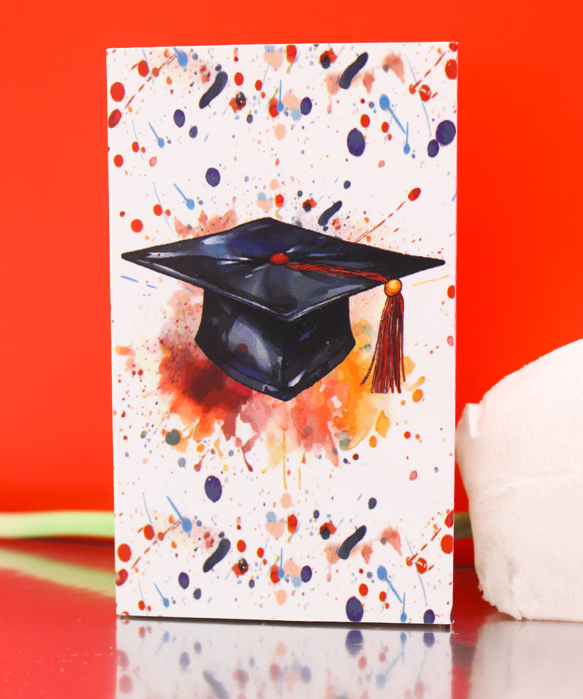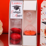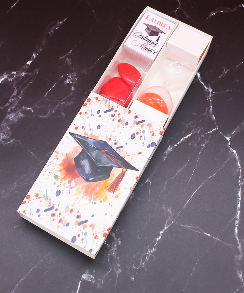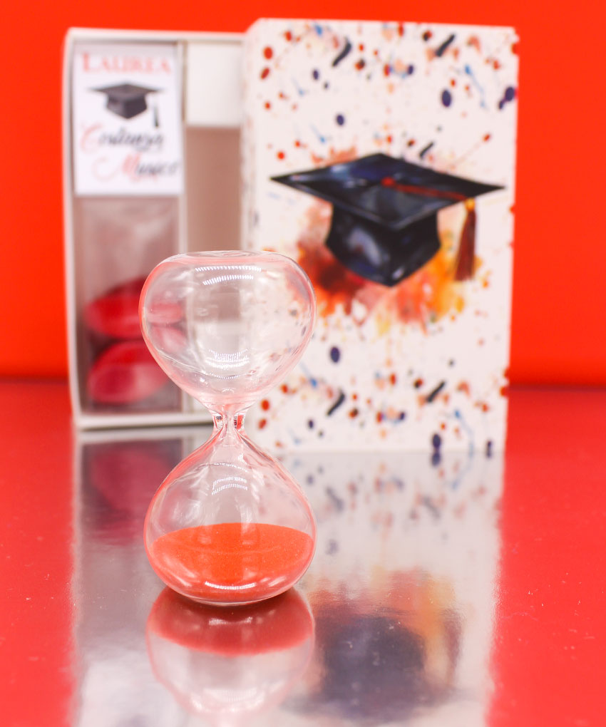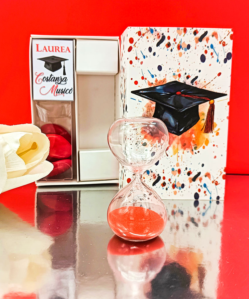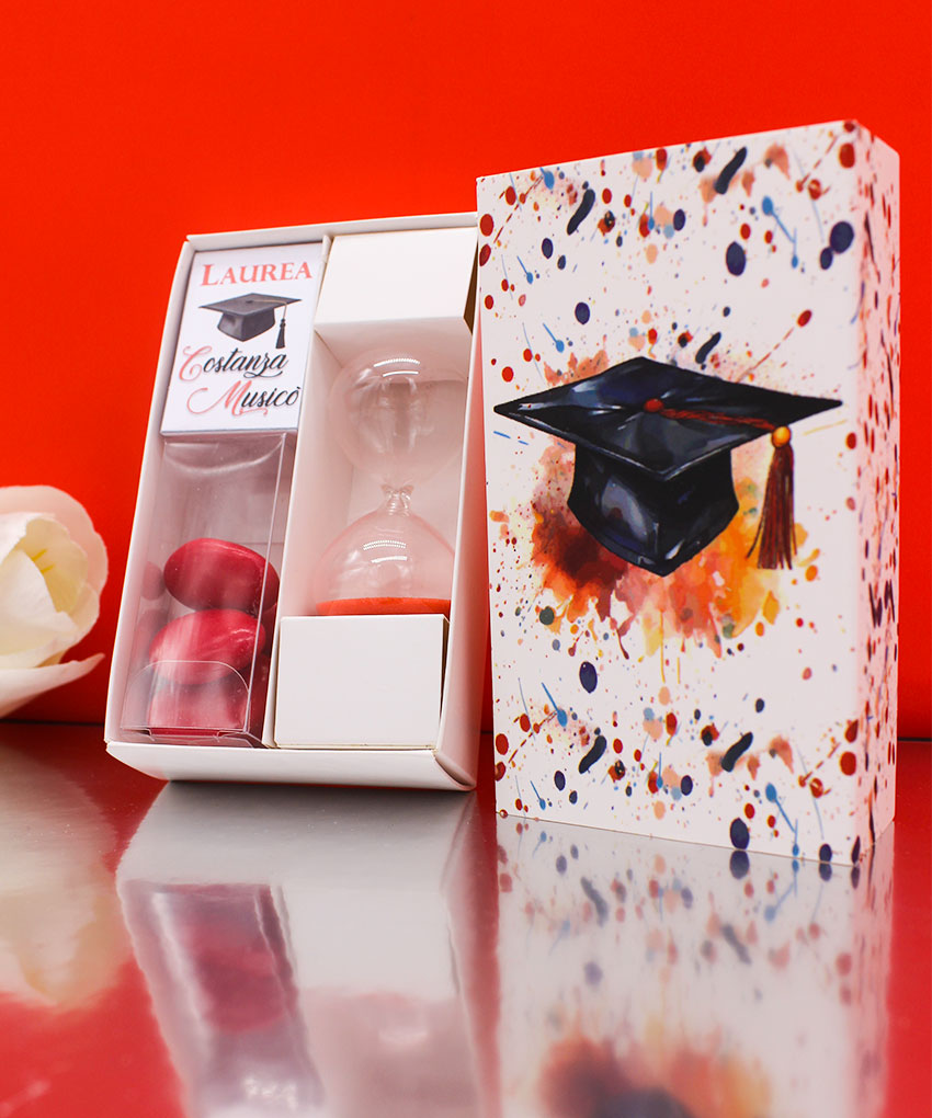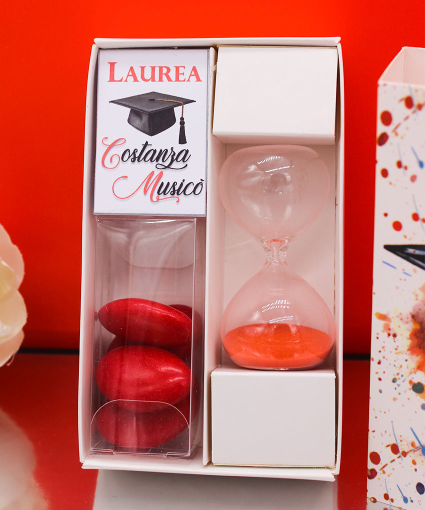 All’interno della scatolina, impreziosita da una mini clessidra in vetro con sabbia rossa, sono inclusi 5 confetti al cioccolato rossi, il colore simbolo della laurea. Il tocco speciale? La personalizzazione con il nome del laureato/a, per rendere questo ricordo ancora più unico e significativo.