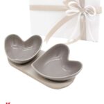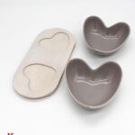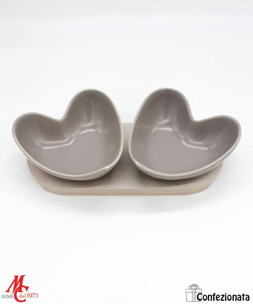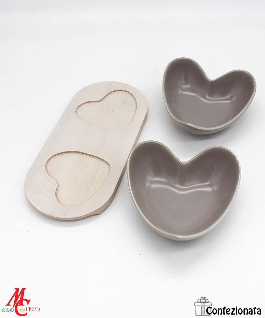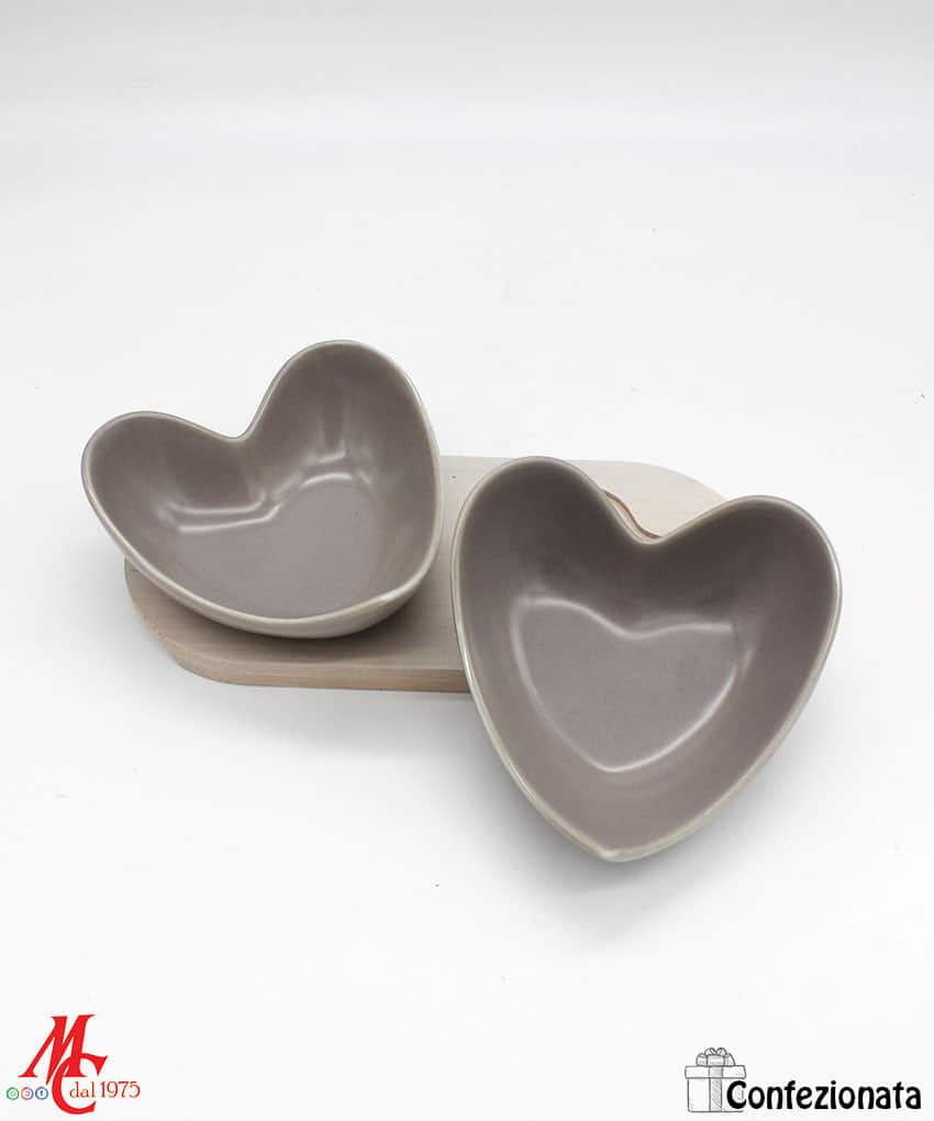Bomboniera Confezionata – Set 2 Ciotole Cuore Porcellana Grigio e Legno Naturale