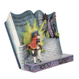 Rivivi l’epico momento de La Bella Addormentata con questa statuetta in stile storybook: il Principe Filippo affronta Malefica trasformata in drago, con un dramma ricco di colore e simbolismo. Realizzata in resina di pietra e dipinta a mano con effetto legno, questa figura di Jim Shore cattura la tensione della battaglia e la bellezza fiabesca della scena. Sul retro della “copertina” è inciso in oro il titolo “Sleeping Beauty”, rendendo l’oggetto un vero e proprio libro tridimensionale.