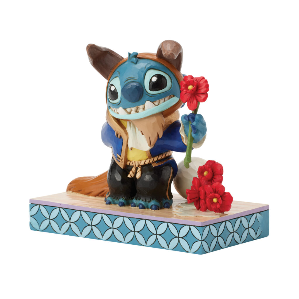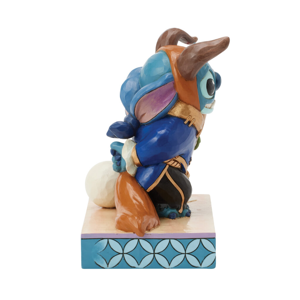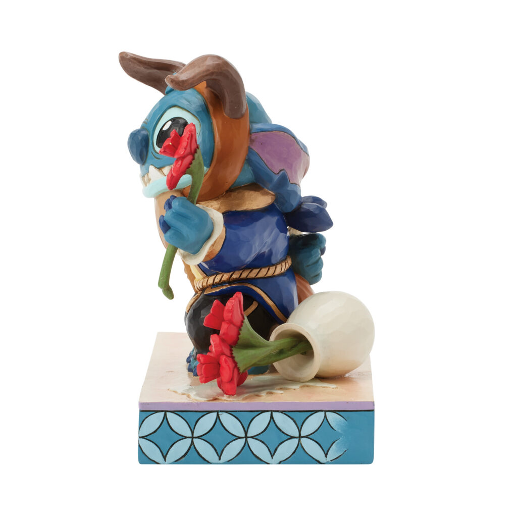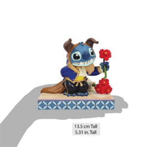 Il simpatico Stitch, travestito da Bestia, è raffigurato con il celebre abito blu, ricco di dettagli e decorazioni folk-art. Ogni pezzo è realizzato in resina di pietra e dipinto a mano, rendendolo unico e ricercato.