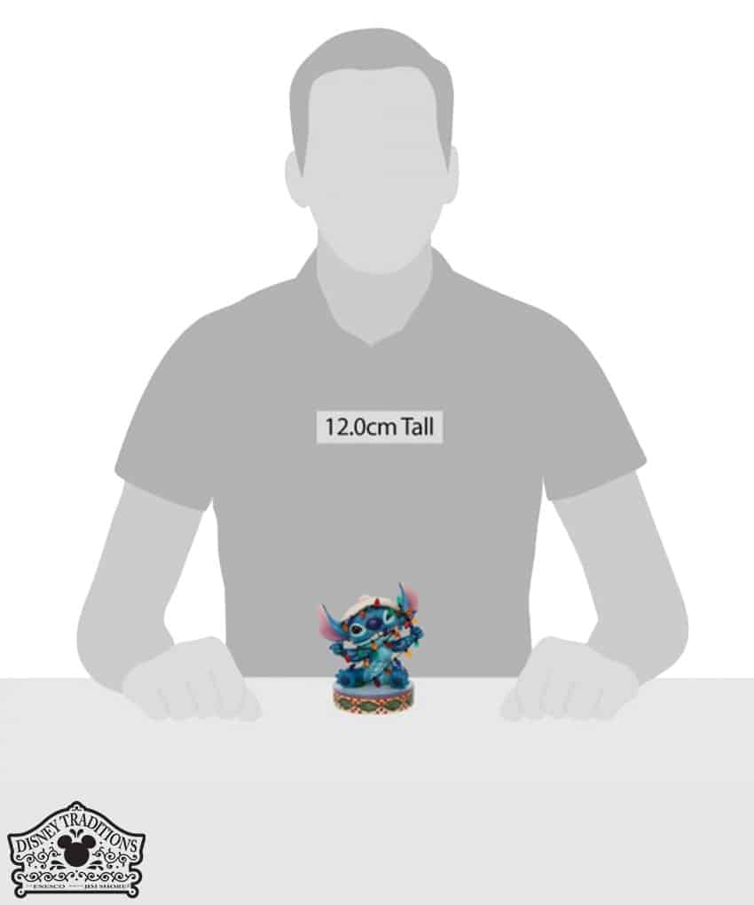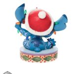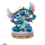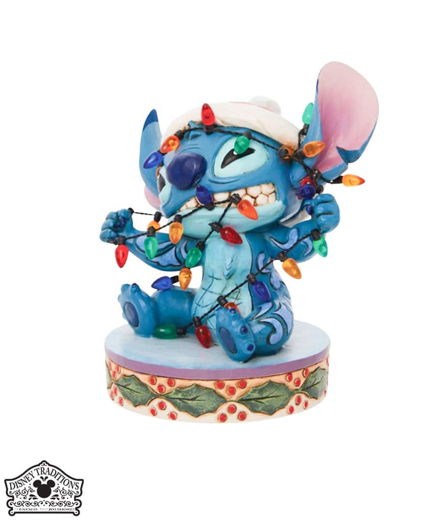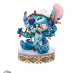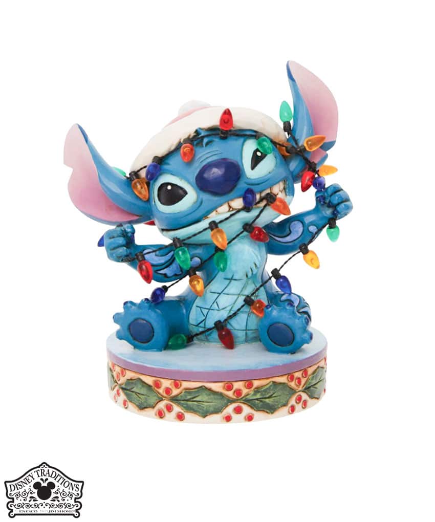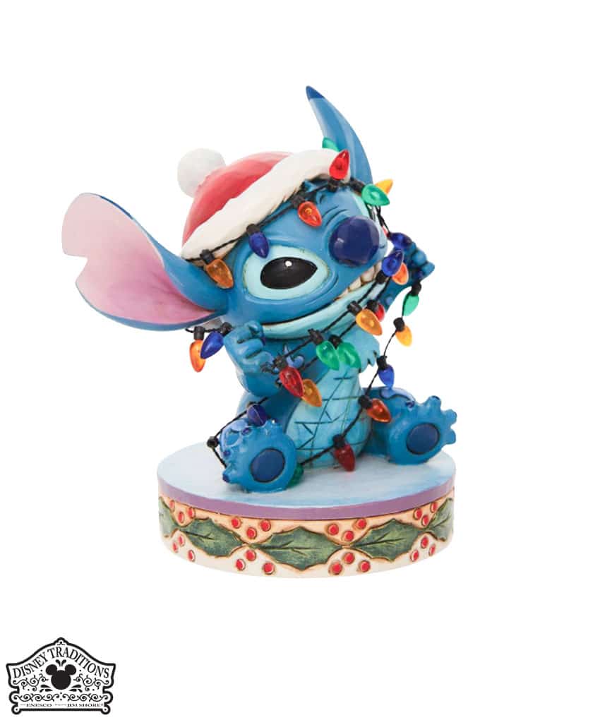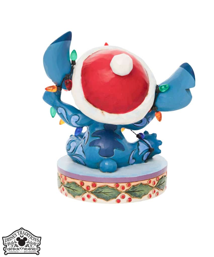 Statuetta festiva di Stich che indossa un cappello di Natale. Cercando di aiutare con le decorazioni natalizie, Stitch si ritrova aggrovigliato con le luci di Natale. Progettato dal pluripremiato artista e scultore Jim Shore per il marchio Disney Traditions.