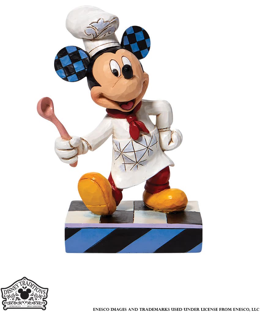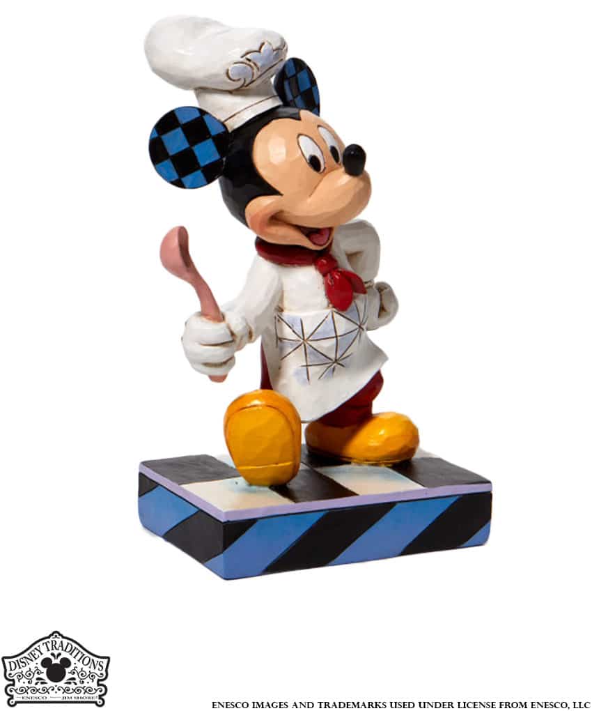 Figura di Topolino con un cappello da chef, un cucchiaio di legno e un grembiule. Buon appetito! Progettato dal pluripremiato artista e scultore Jim Shore per la collezione Disney Traditions